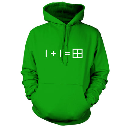 Unisex Hoodie, Our unisex style 1 + 1 = Window Hooded top is printed on our 280 GSM kangaroo pocket garment and is Available in 9 Colours and with sizes Small to XXL.