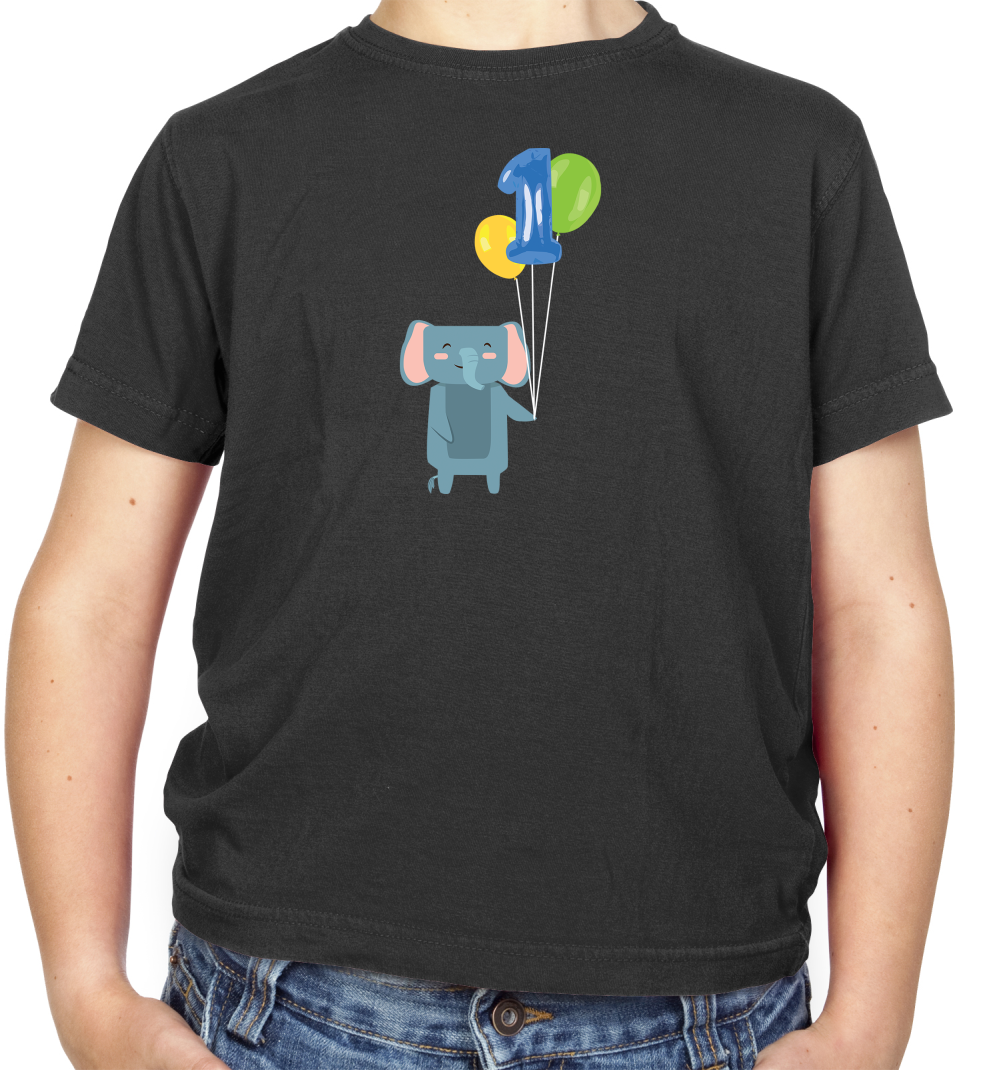 Kids T-shirt: Our Kid's Unisex style 1st Birthday Elephant T-shirt is printed on our 150 GSM ringspun cotton garment and is available on 8 different colours.
