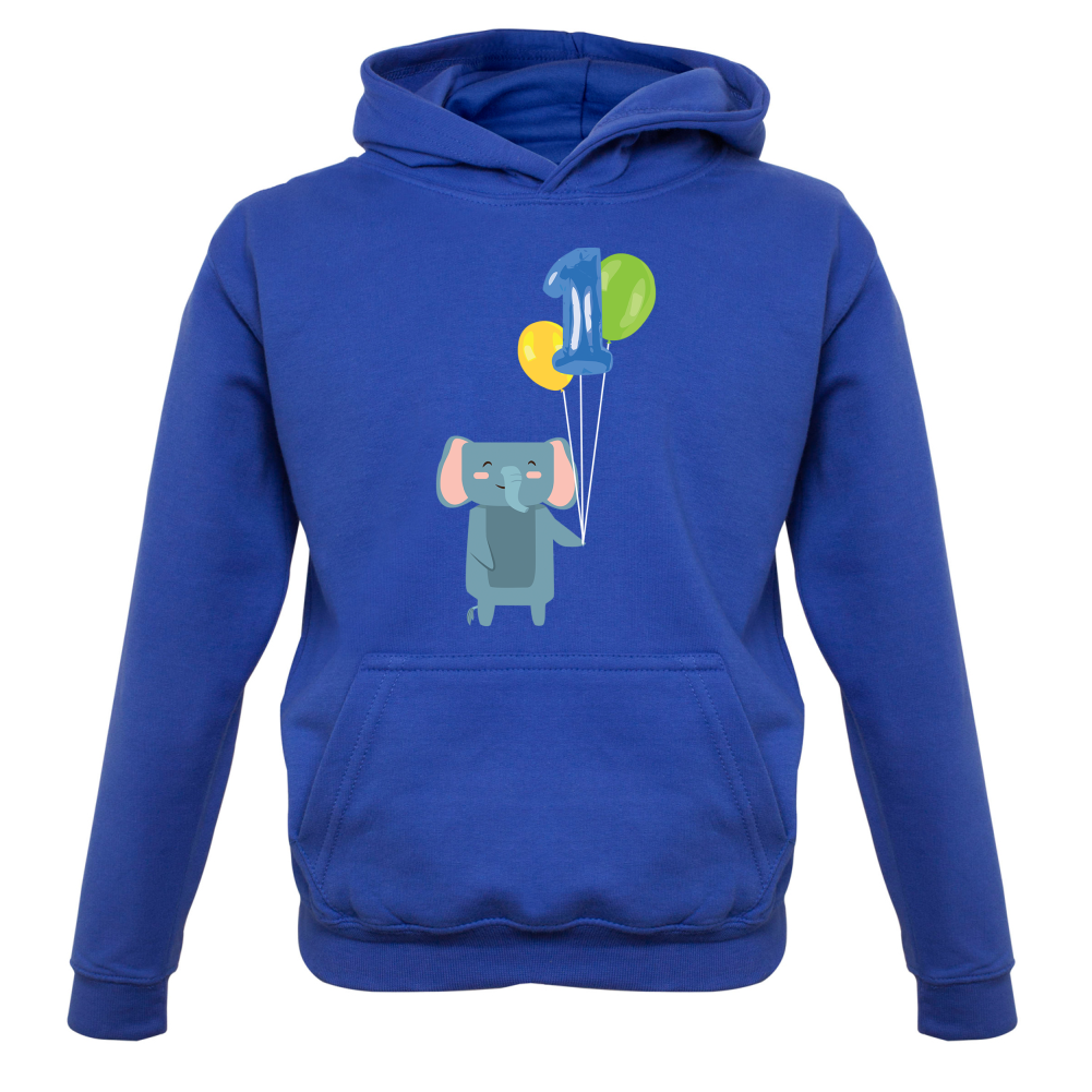 Kids Hoodie: Our kids unisex style 1st Birthday Elephant Hoodie is printed on our 300 GSM kangaroo pocket hooded top and is available on 7 different Colours.
