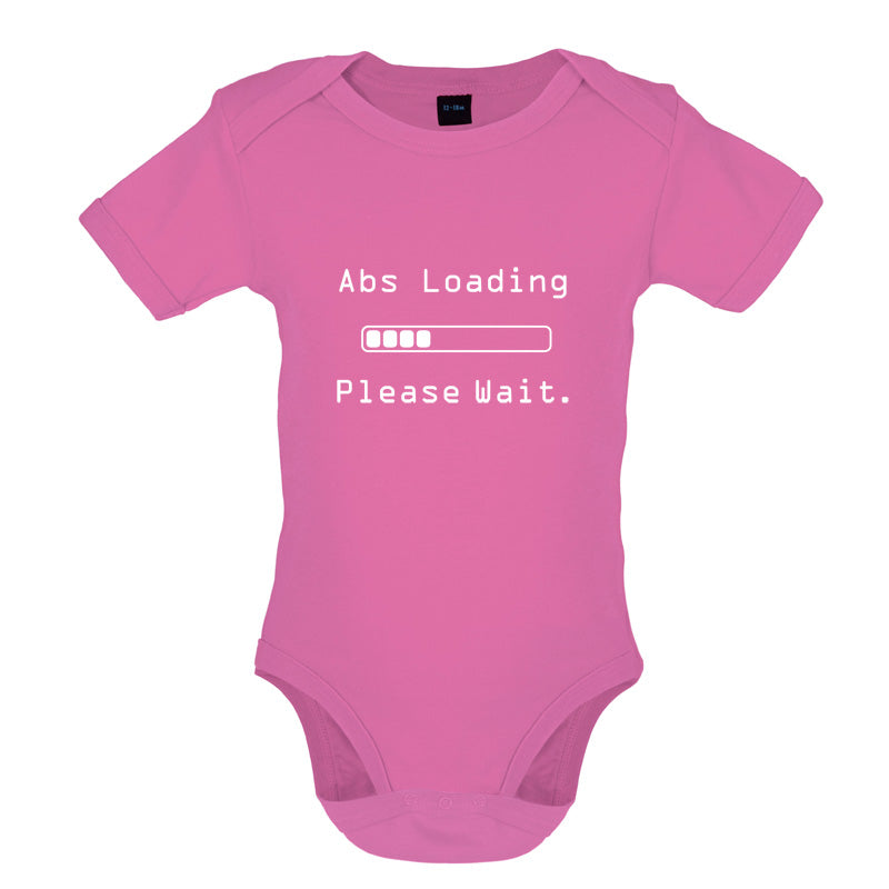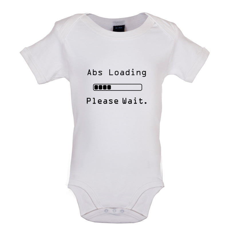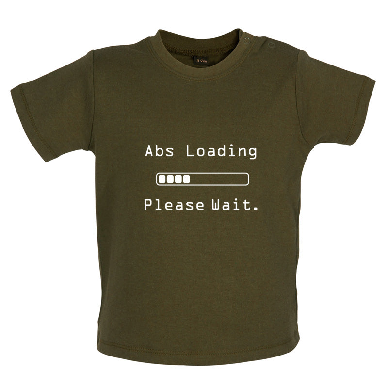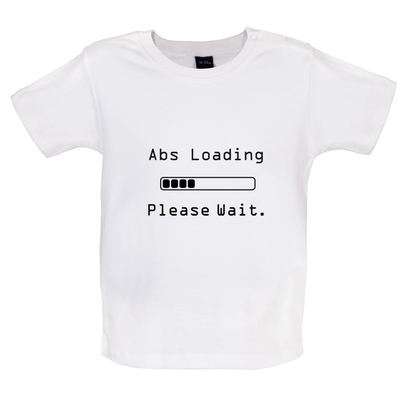 Baby/Toddler T-shirt: Our Baby Unisex style Abs Loading Please Wait T-shirt is printed on our high quality 200 gsm ringspun cotton garment which features shoulder poppers to ease getting your little one dressed. Our Baby T-shirts are available in a choice of Eight colours.