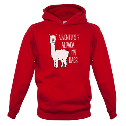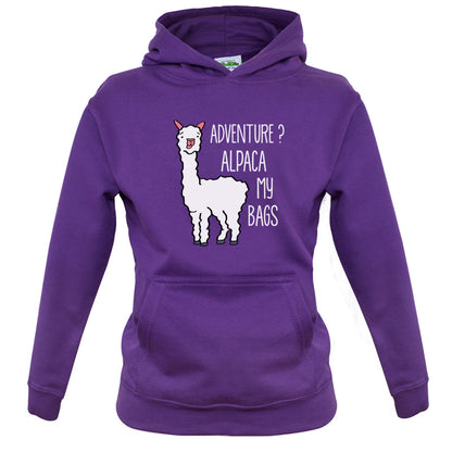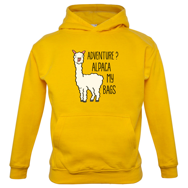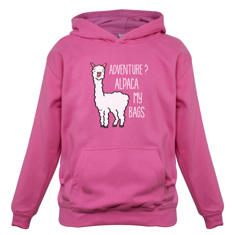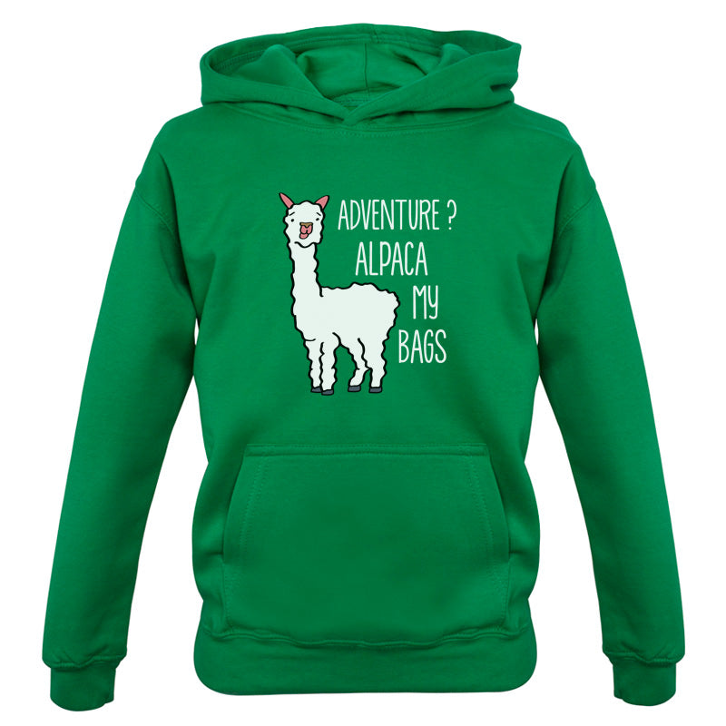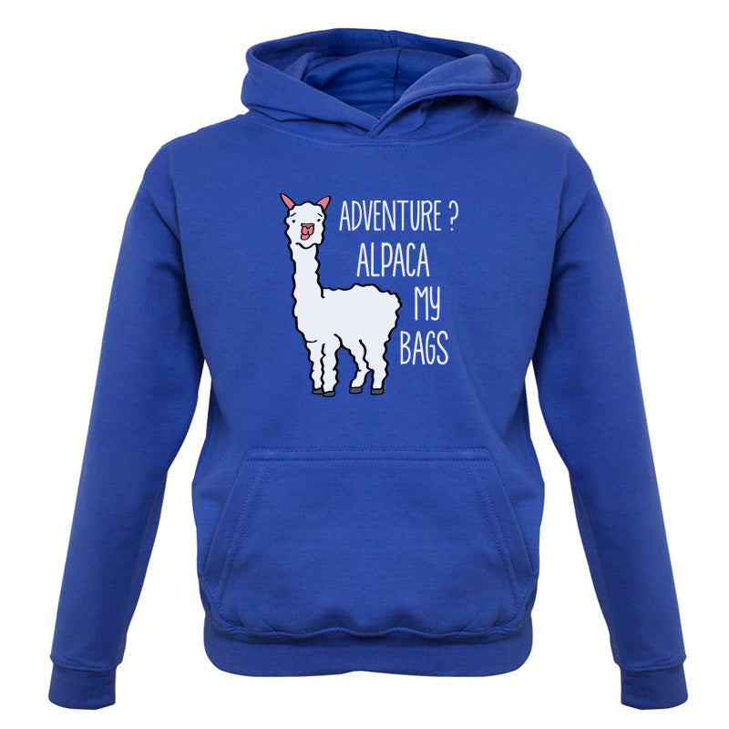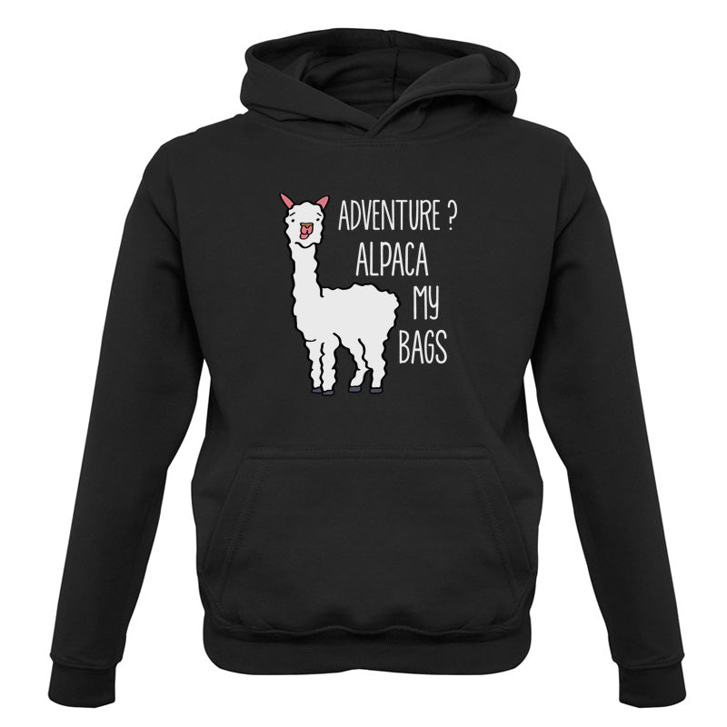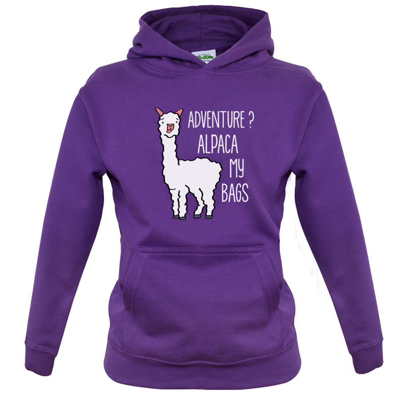 Kids Hoodie: Our kids unisex style Adventure Alpaca My Bags Hoodie is printed on our 300 GSM kangaroo pocket hooded top and is available on 7 different Colours.