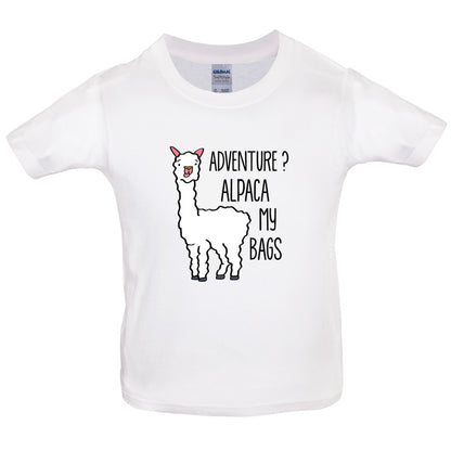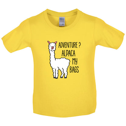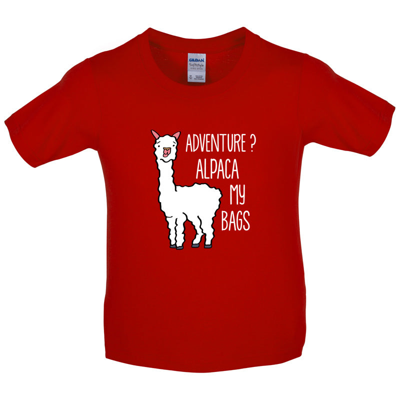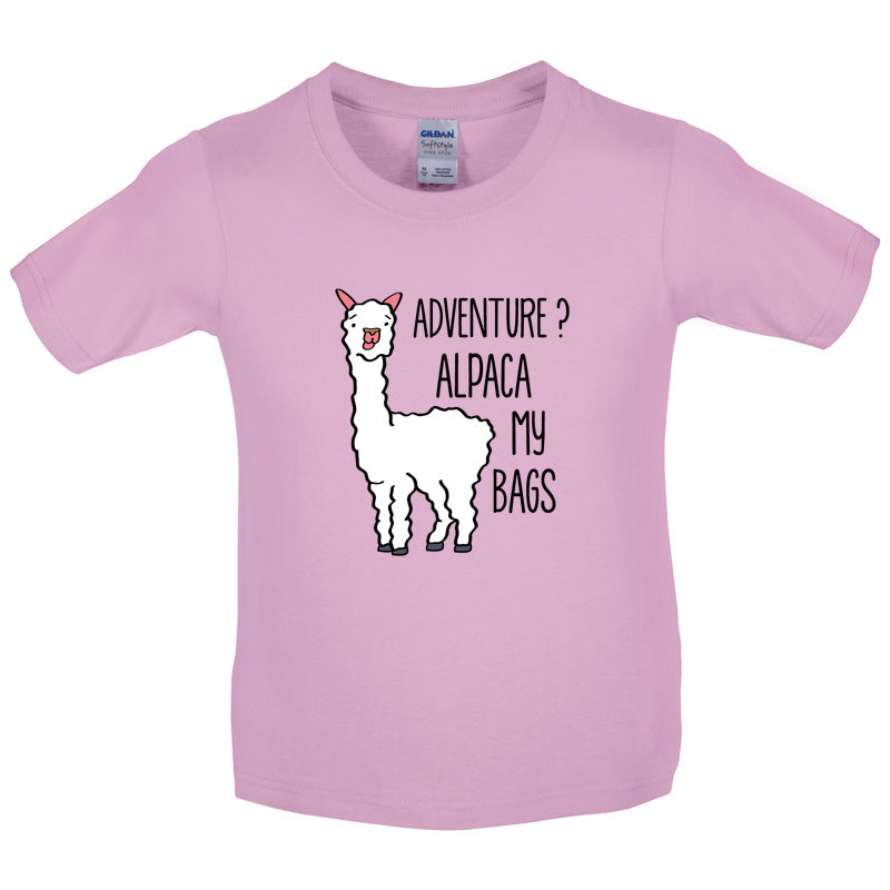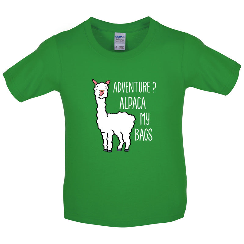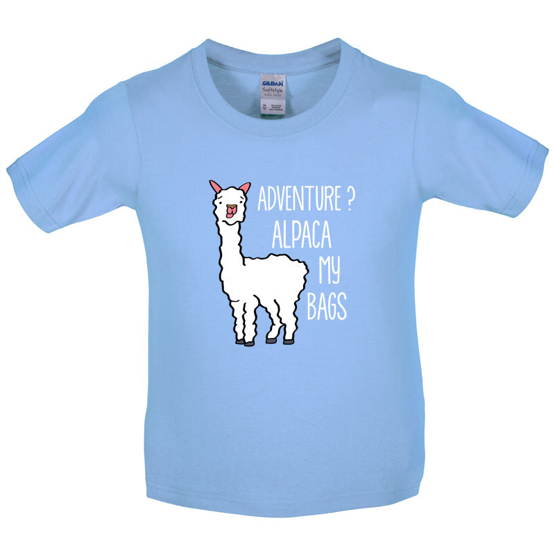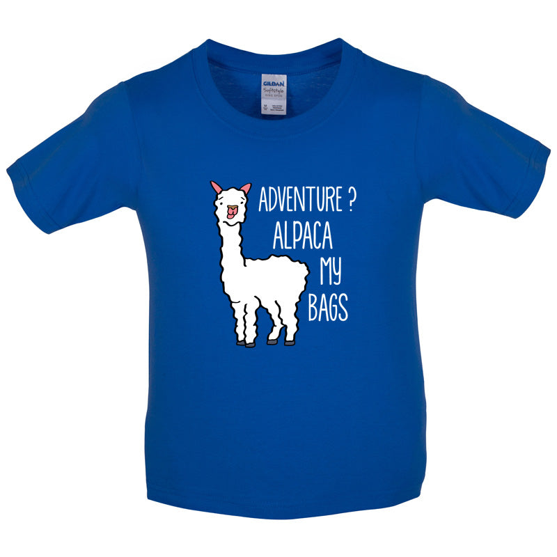 Kids T-shirt: Our Kid's Unisex style Adventure Alpaca My Bags T-shirt is printed on our 150 GSM ringspun cotton garment and is available on 8 different colours.