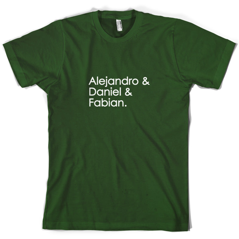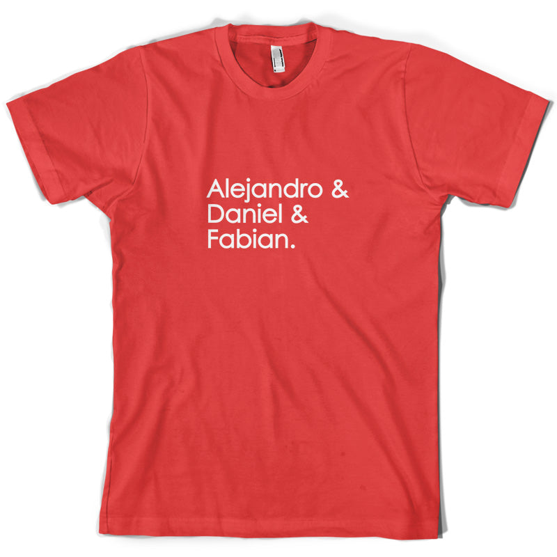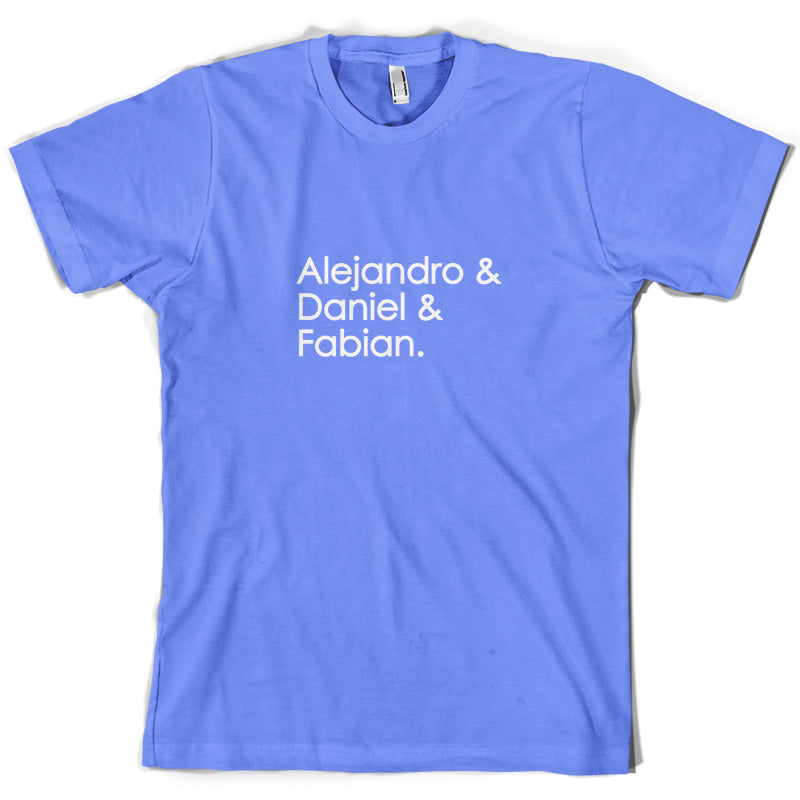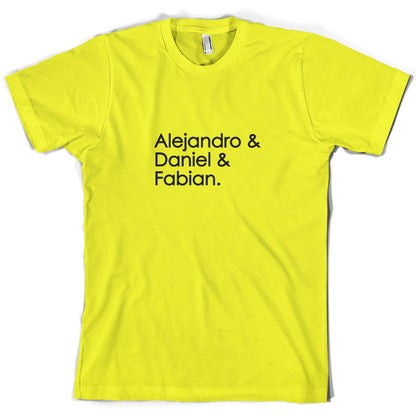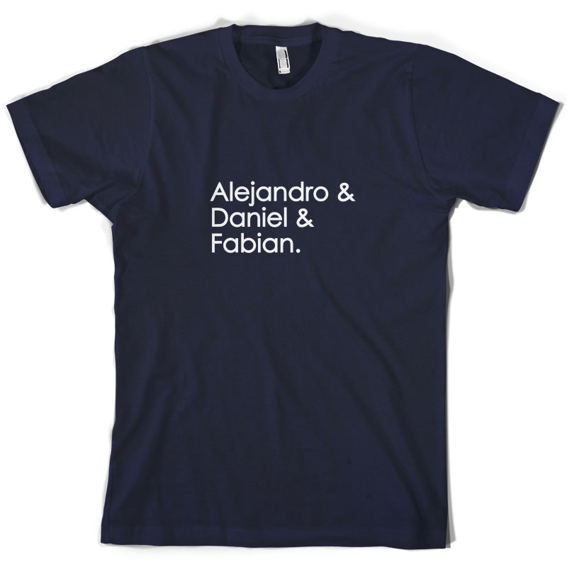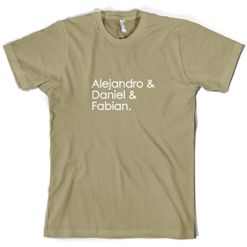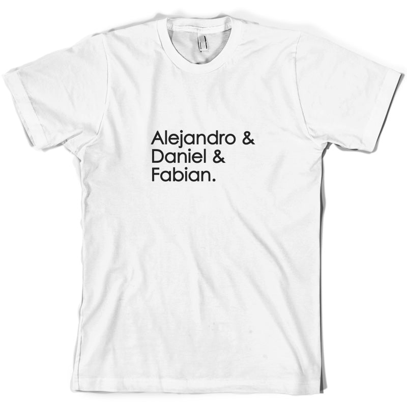 Mens Unisex T-Shirt, our men's Alejandro & Daniel & Fabian t shirt is printed onto our premium 190 GSM one piece crew neck t-shirt. Available in 10 Colours and from Size Small to XXL.