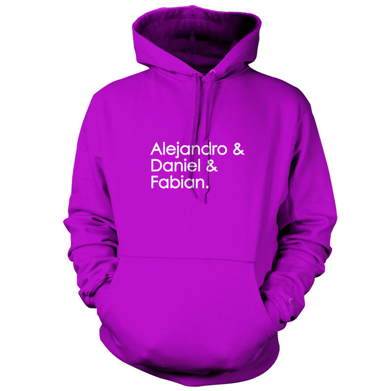 Unisex Hoodie, Our unisex style Alejandro & Daniel & Fabian Hooded top is printed on our 280 GSM kangaroo pocket garment and is Available in 9 Colours and with sizes Small to XXL.
