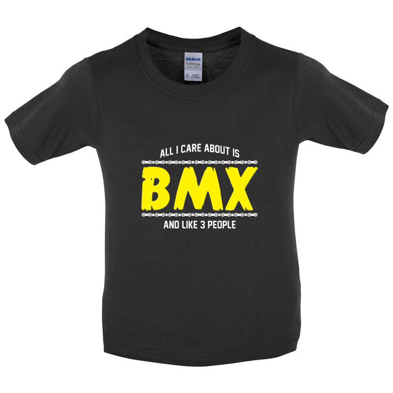 Kids T-shirt: Our Kid's Unisex style All I Care About Is BMX T-shirt is printed on our 150 GSM ringspun cotton garment and is available on 8 different colours.