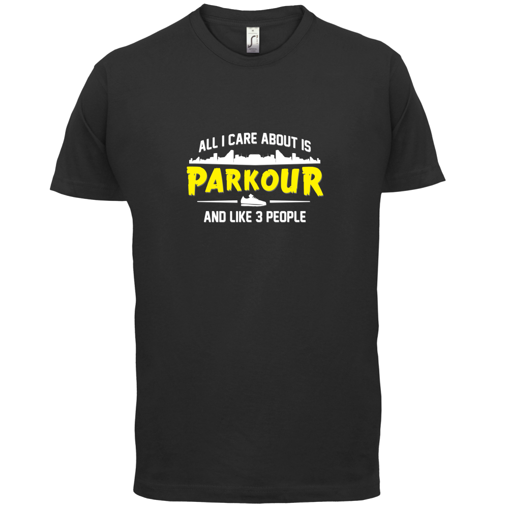 Mens Unisex T-Shirt, our men's All I Care About Is Parkour t shirt is printed onto our premium 190 GSM one piece crew neck t-shirt. Available in 10 Colours and from Size Small to XXL.