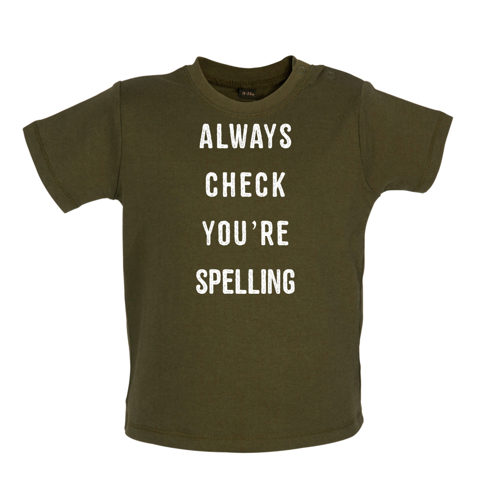 Baby/Toddler T-shirt: Our Baby Unisex style Always Check You're Spelling T-shirt is printed on our high quality 200 gsm ringspun cotton garment which features shoulder poppers to ease getting your little one dressed. Our Baby T-shirts are available in a choice of Eight colours.