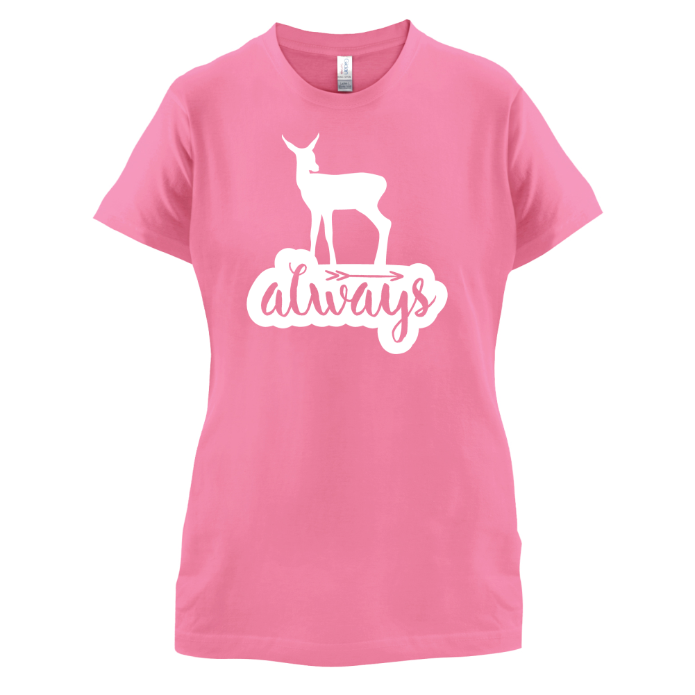 Women's Slim fit T-shirt, our ladies Always Deer t-shirt is printed on our popular 150 GSM ring spun womens garment. Available in 11 colours and from Size Small to XXL.
