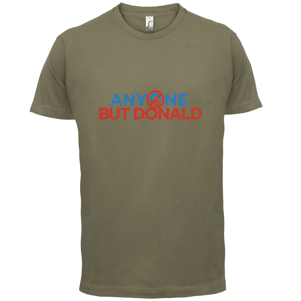 Mens Unisex T-Shirt, our men's Anyone But Donald t shirt is printed onto our premium 190 GSM one piece crew neck t-shirt. Available in 10 Colours and from Size Small to XXL.