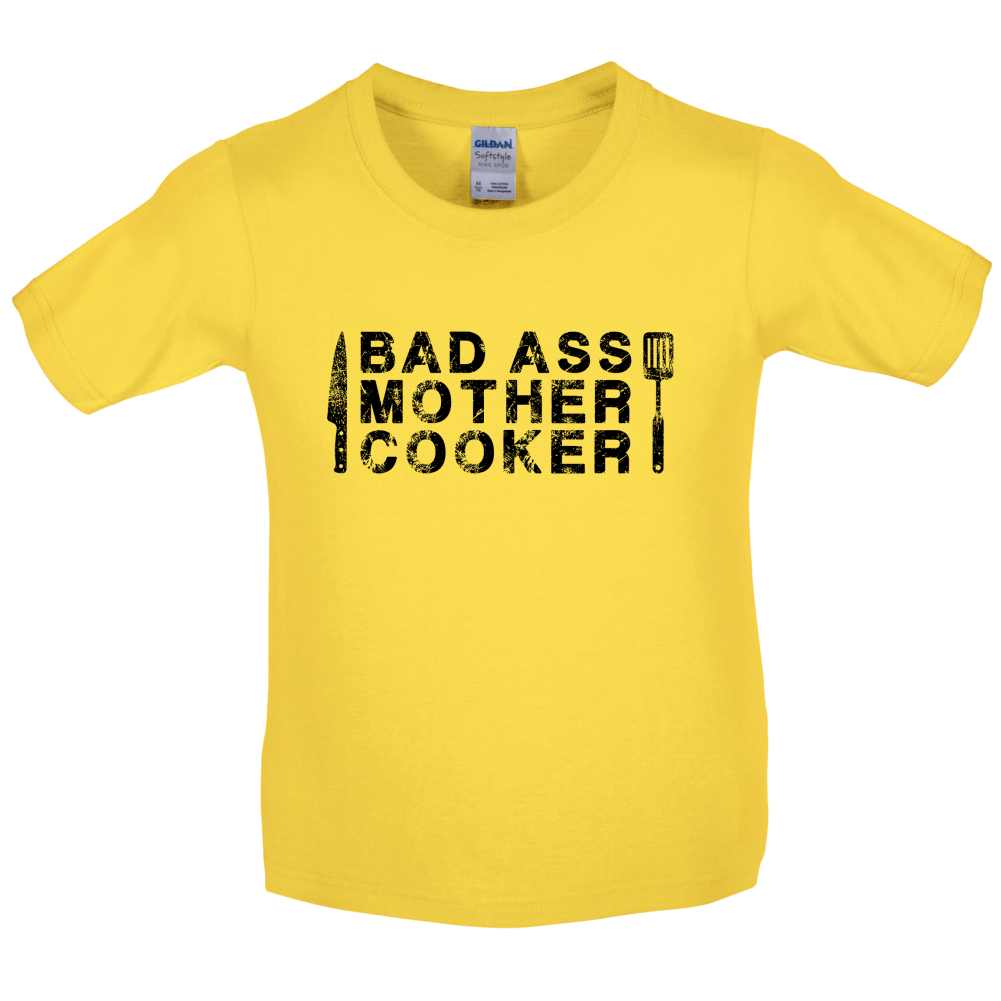 Kids T-shirt: Our Kid's Unisex style Bad Ass Mother Cooker T-shirt is printed on our 150 GSM ringspun cotton garment and is available on 8 different colours.