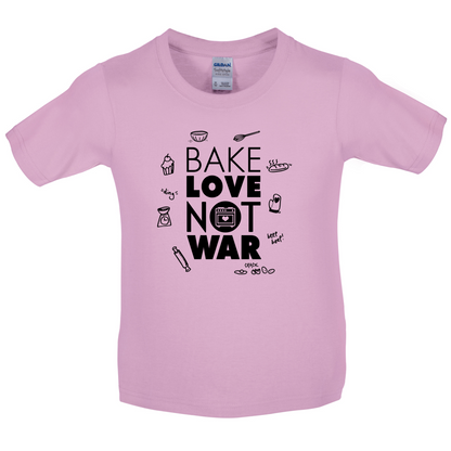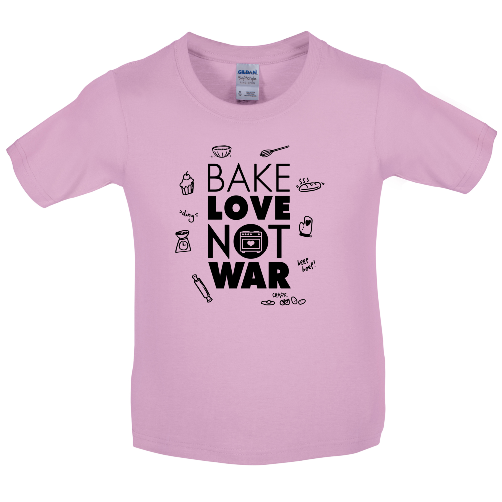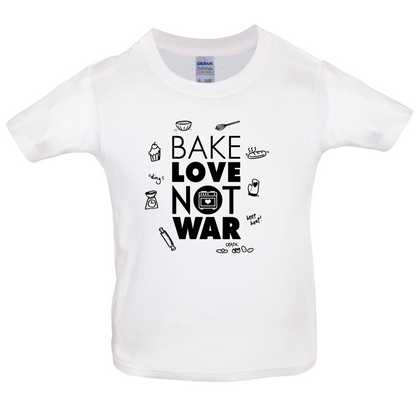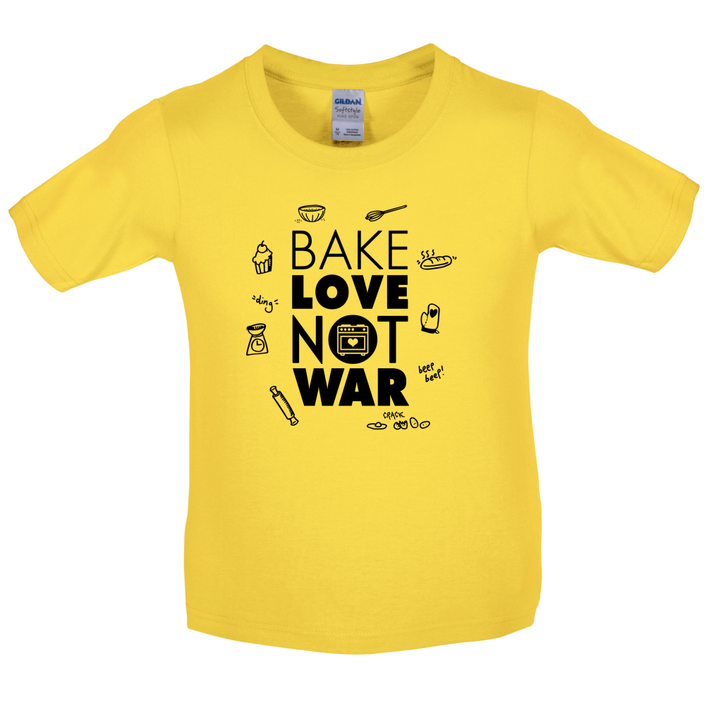 Kids T-shirt: Our Kid's Unisex style Bake Love Not War T-shirt is printed on our 150 GSM ringspun cotton garment and is available on 8 different colours.