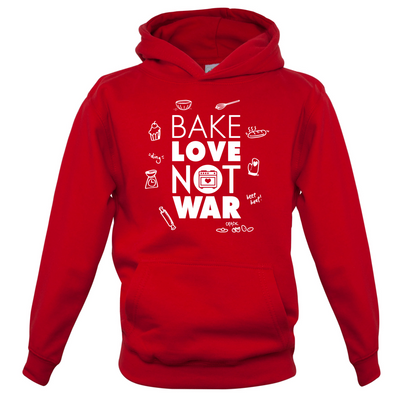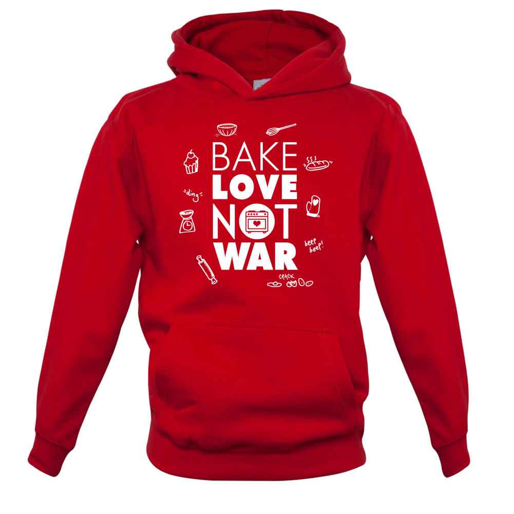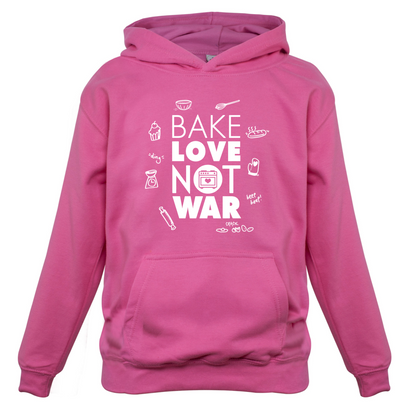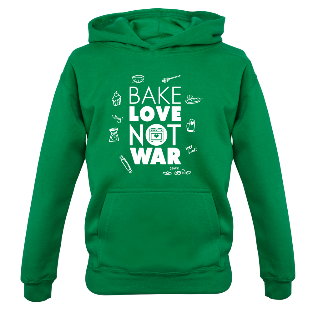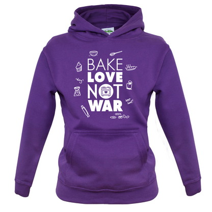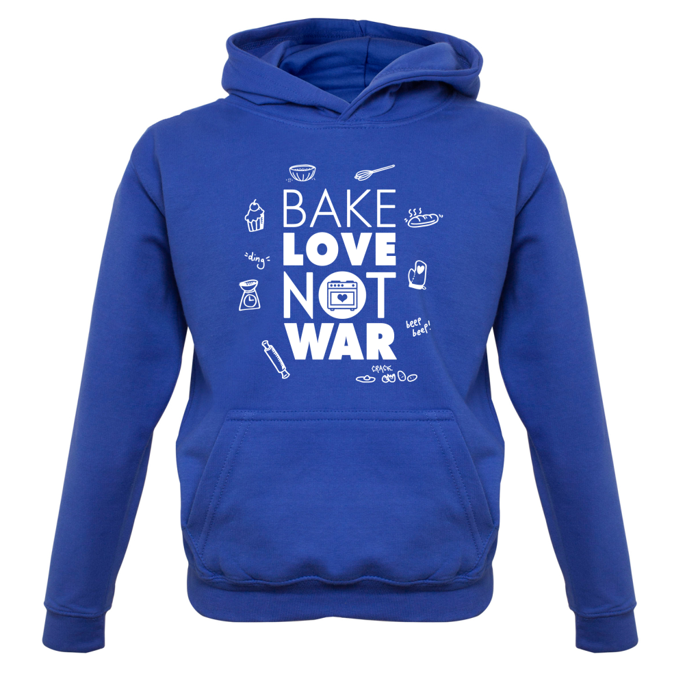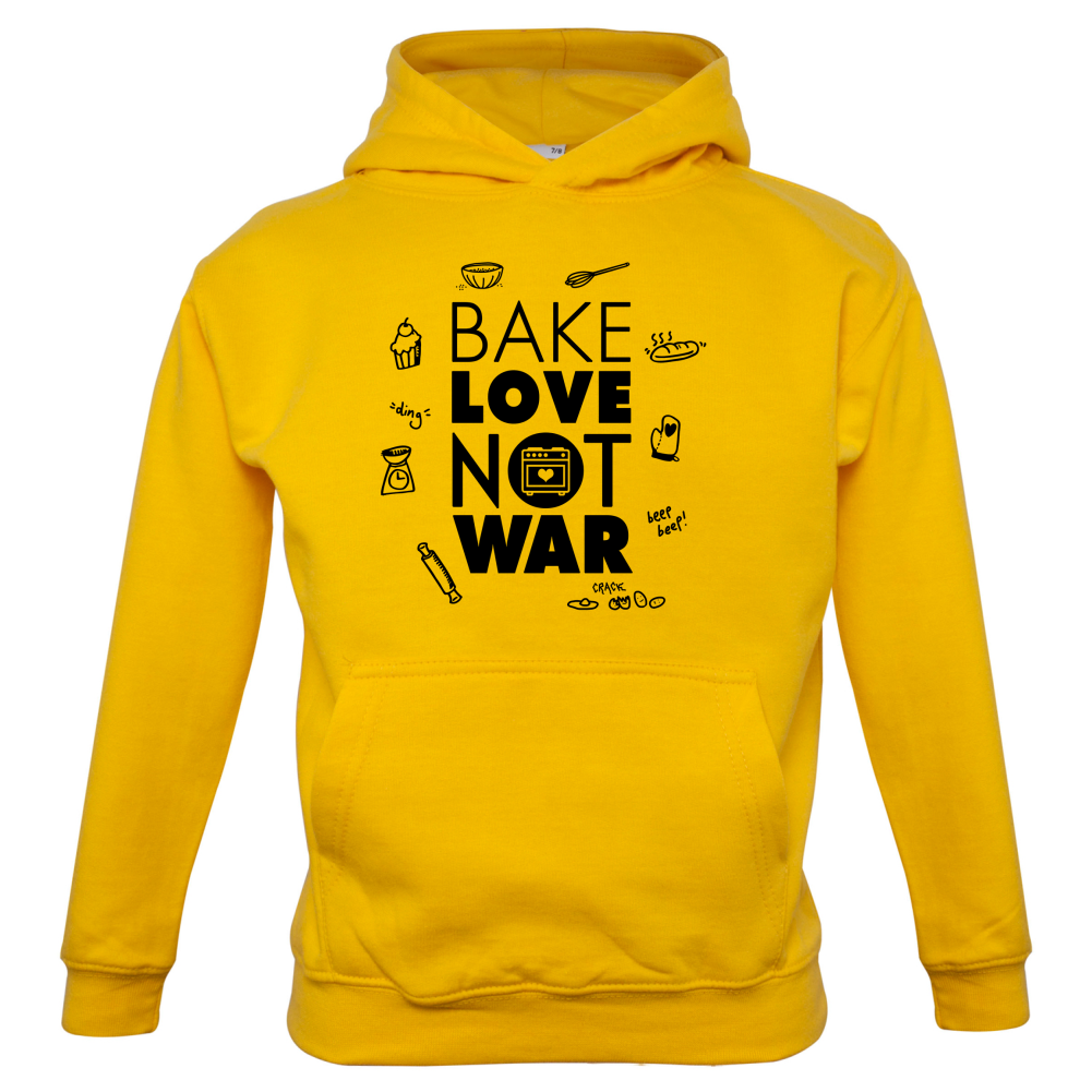Kids Hoodie: Our kids unisex style Bake Love Not War Hoodie is printed on our 300 GSM kangaroo pocket hooded top and is available on 7 different Colours.