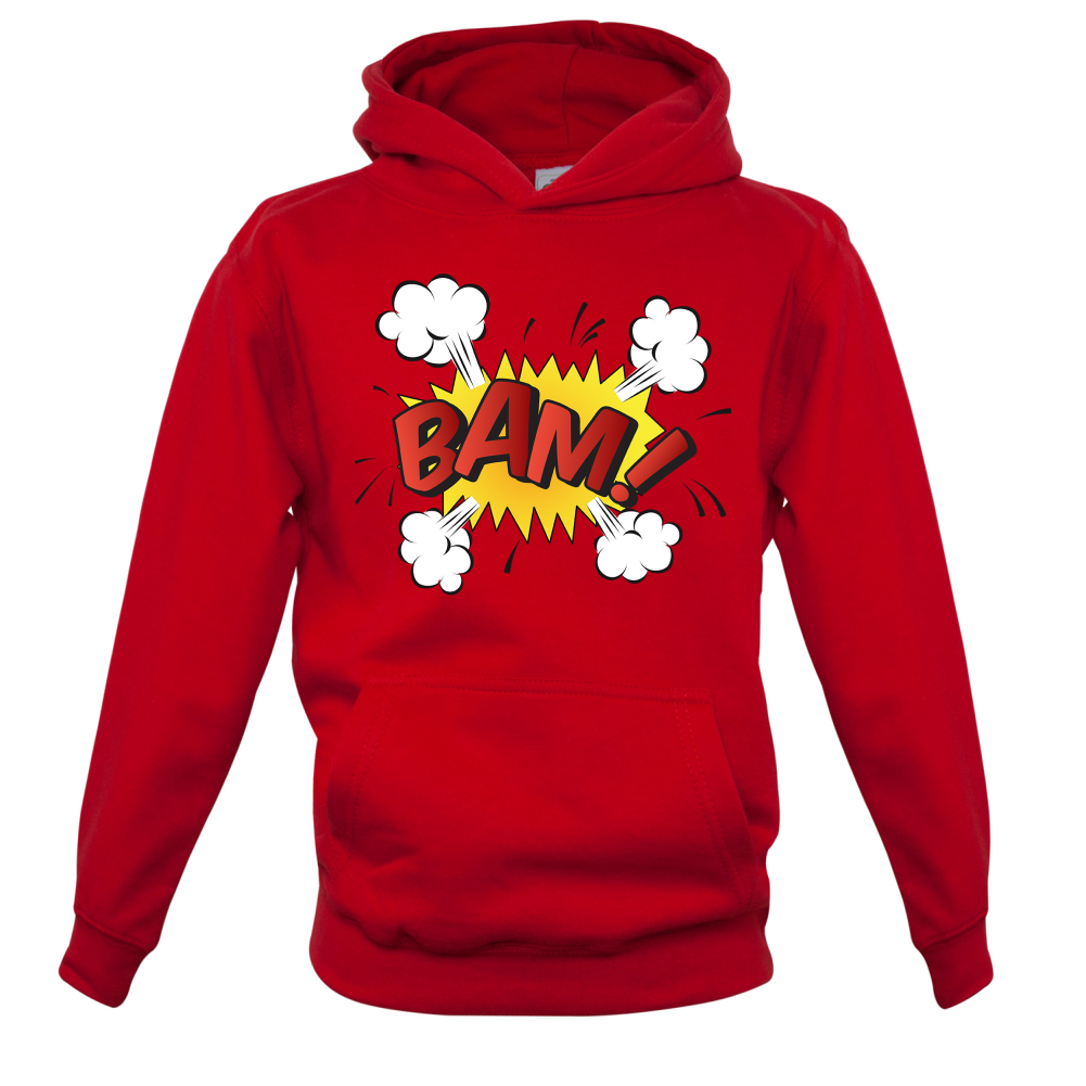 Kids Hoodie: Our kids unisex style Bam! Word Art Hoodie is printed on our 300 GSM kangaroo pocket hooded top and is available on 7 different Colours.