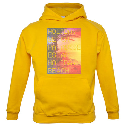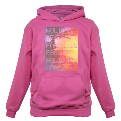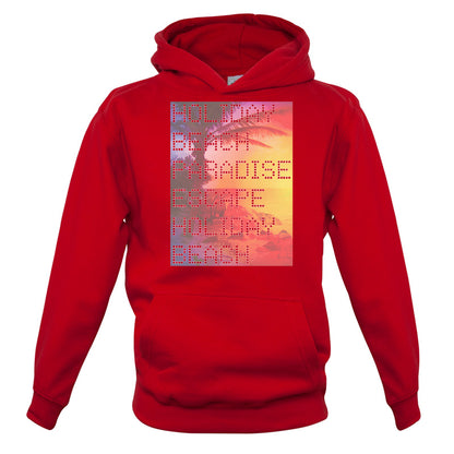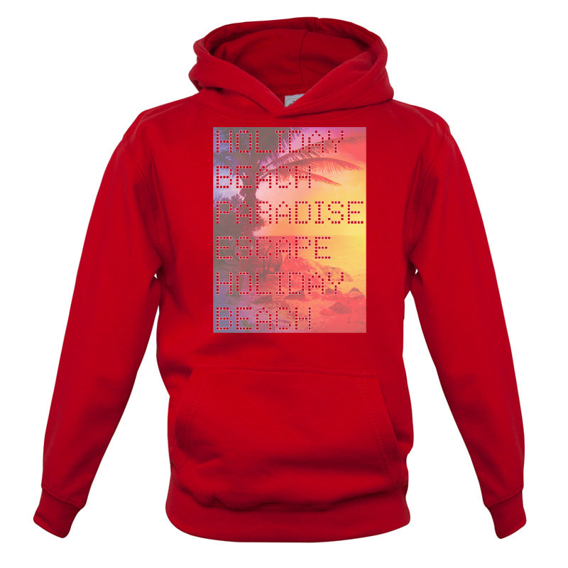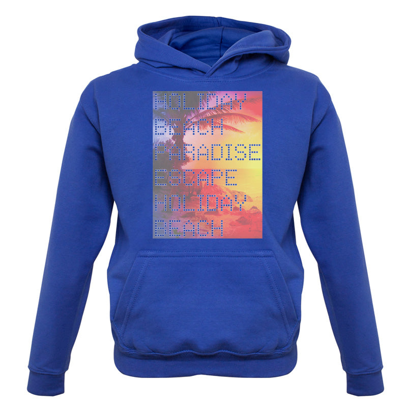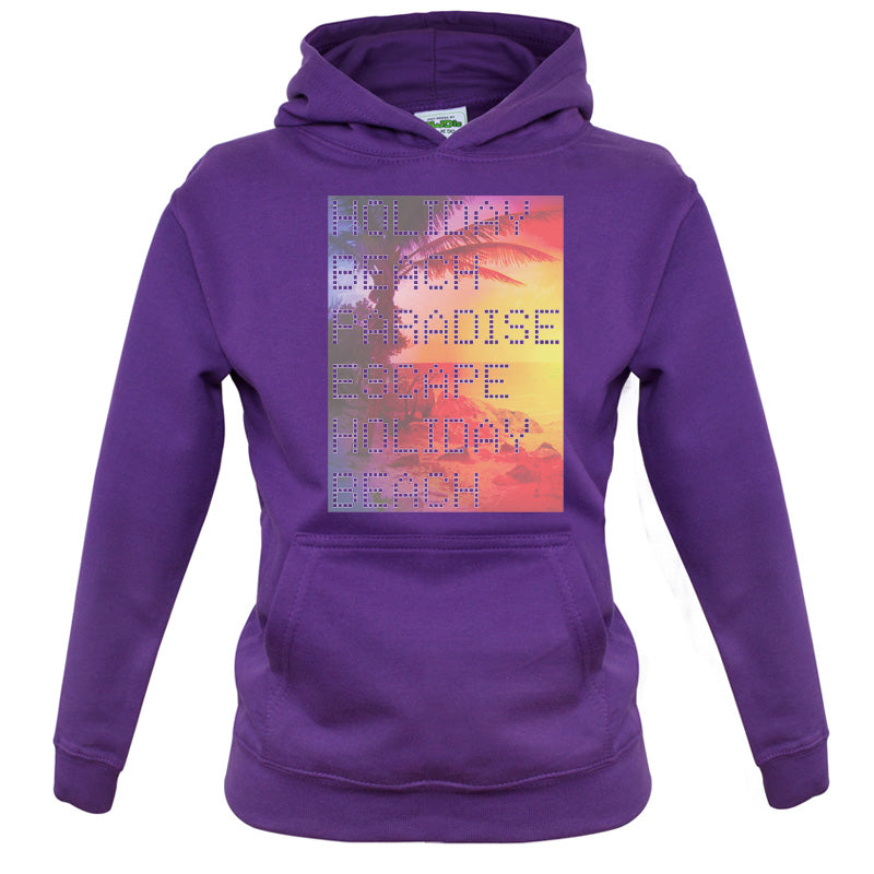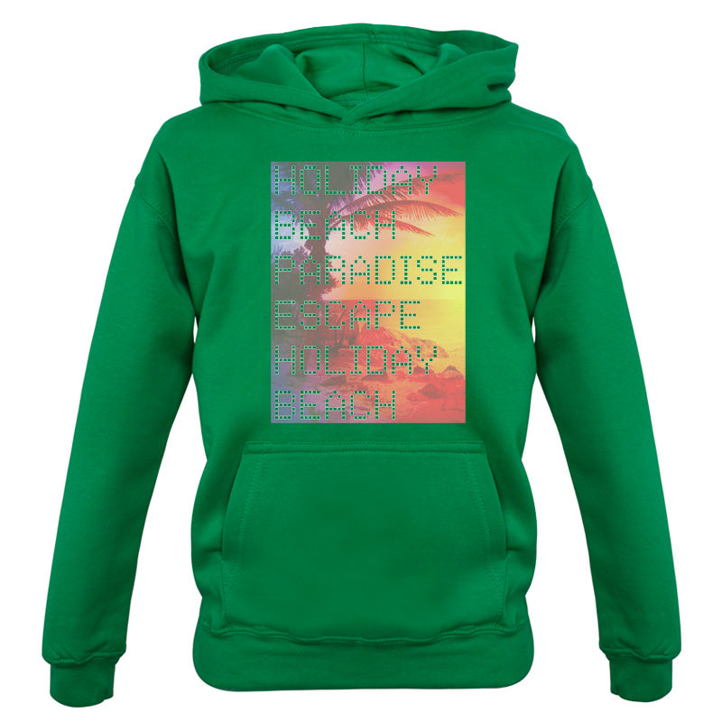 Kids Hoodie: Our kids unisex style Beach Scene Holiday Paradise Hoodie is printed on our 300 GSM kangaroo pocket hooded top and is available on 7 different Colours.