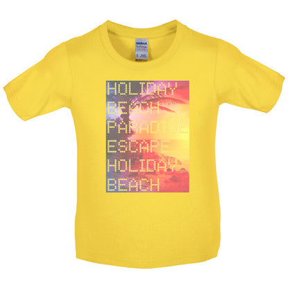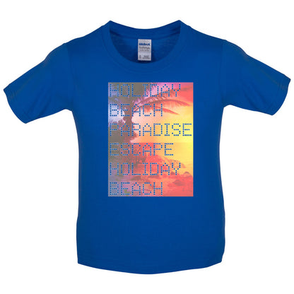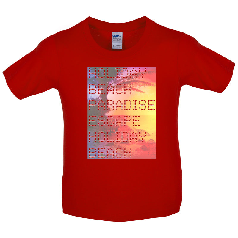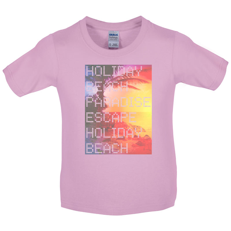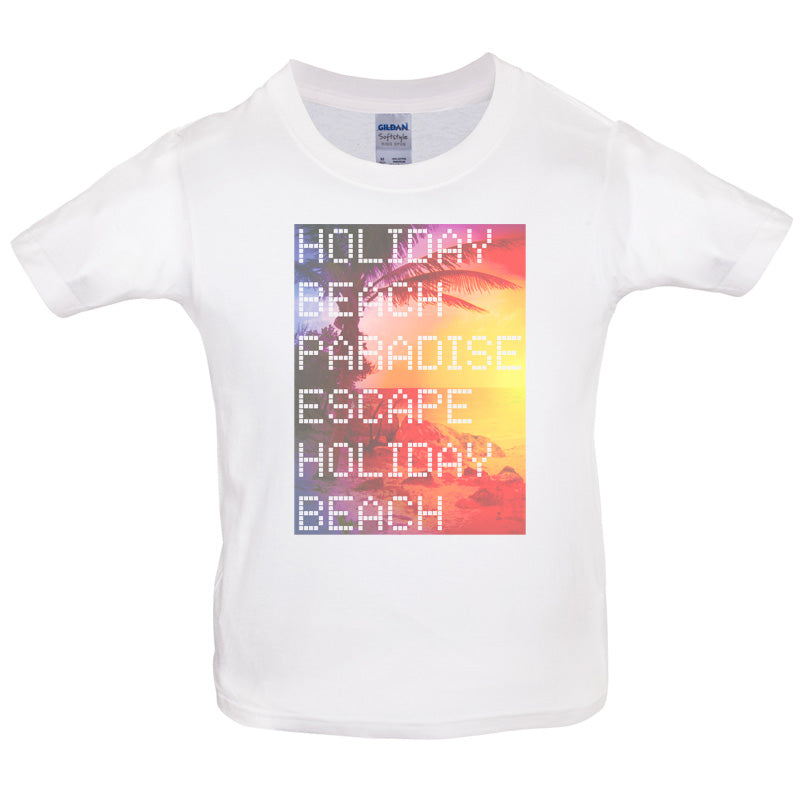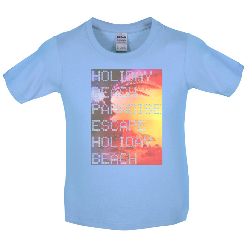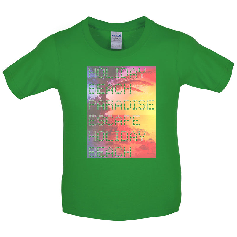 Kids T-shirt: Our Kid's Unisex style Beach Scene Holiday Paradise T-shirt is printed on our 150 GSM ringspun cotton garment and is available on 8 different colours.
