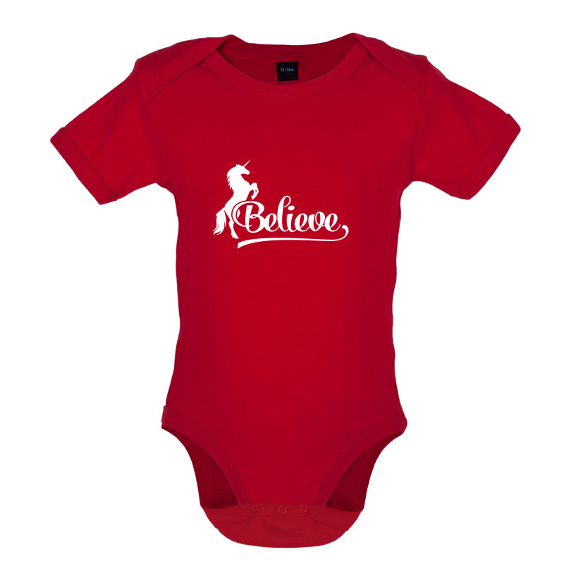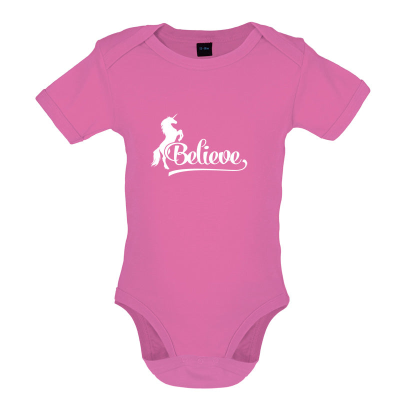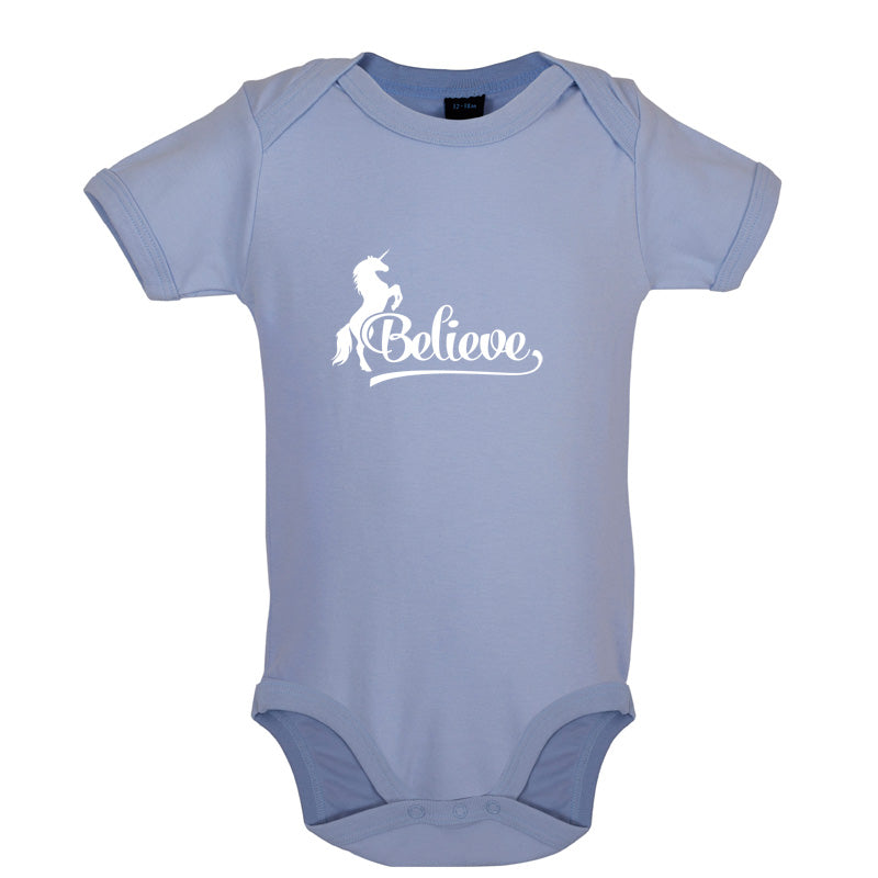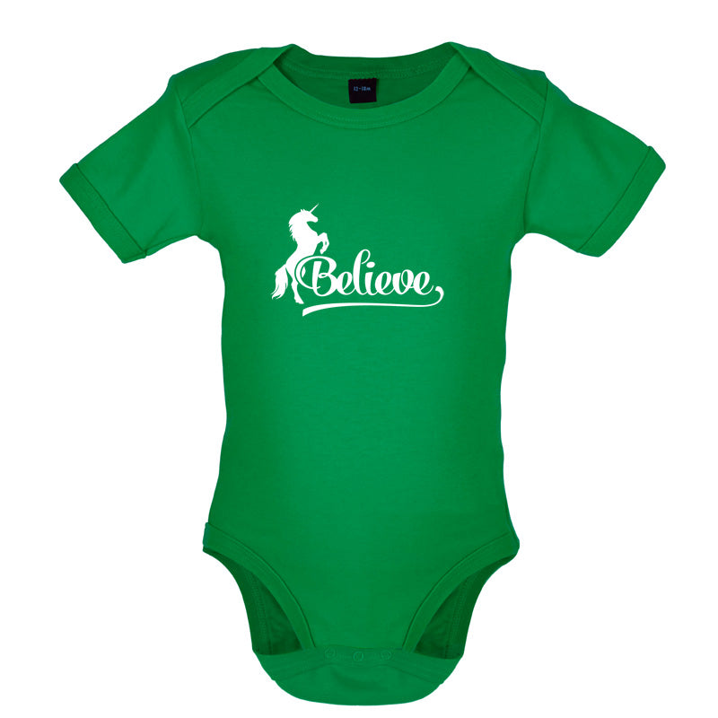 Babygrow/Bodysuit: Our Baby unisex style Believe Unicorn Babygrow is printed on our 200 GSM short sleeve bodysuit and is available in a choice of 6 different Colours.