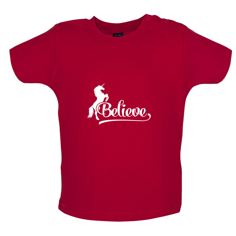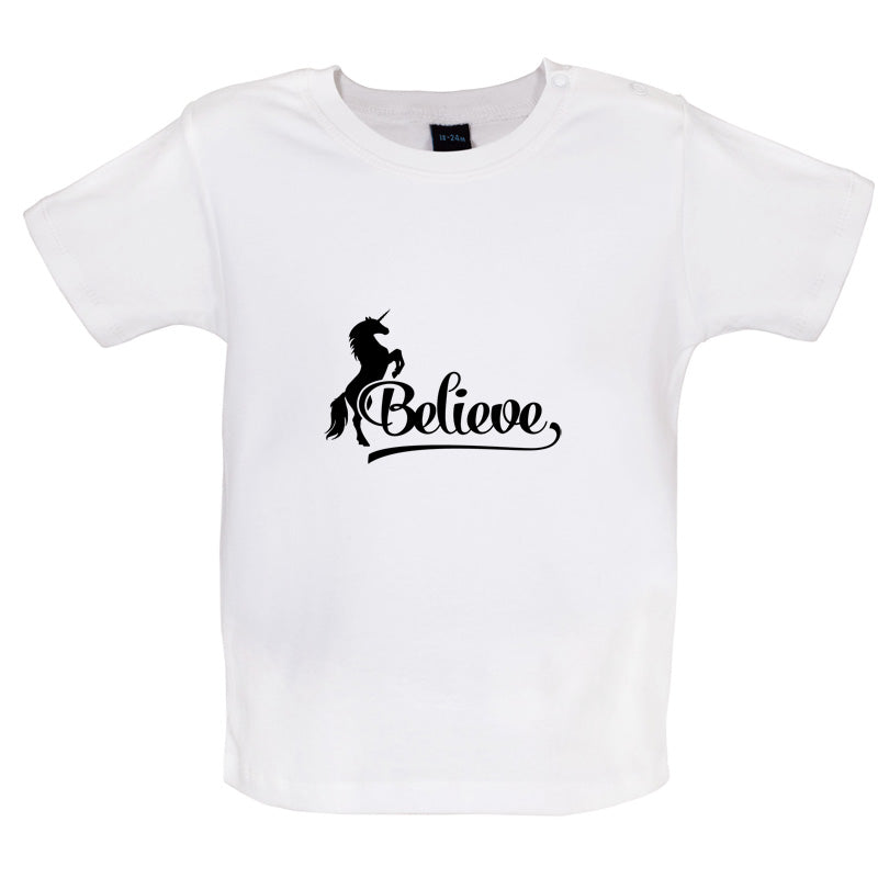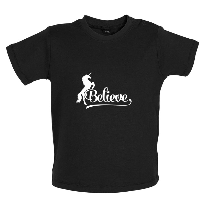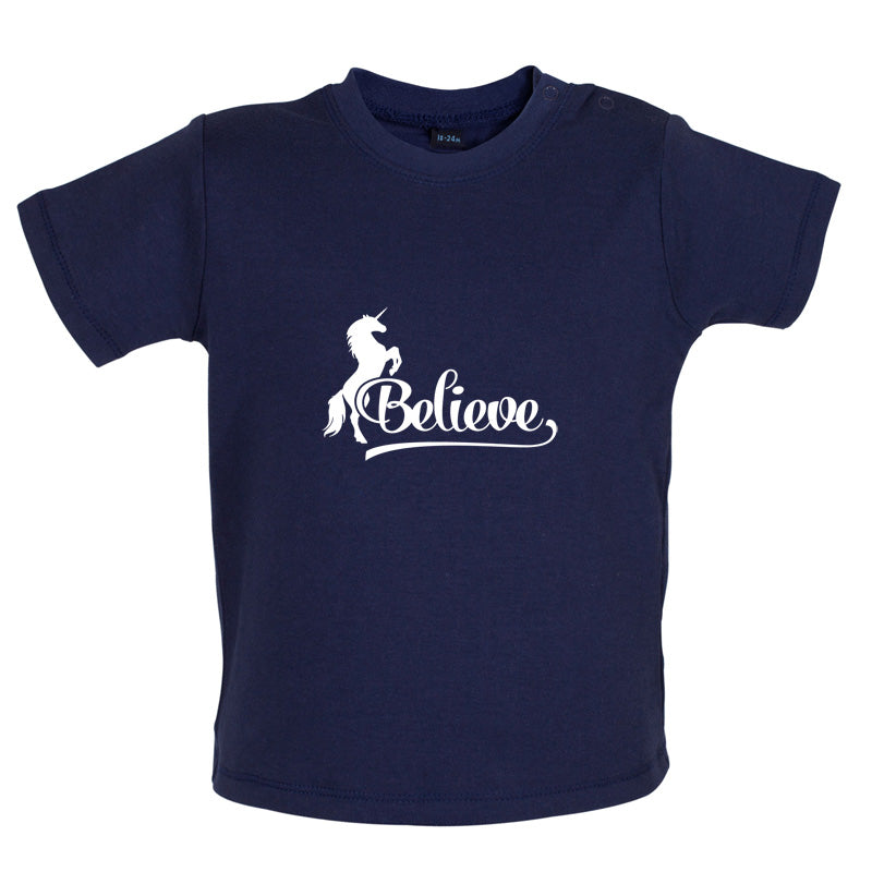 Baby/Toddler T-shirt: Our Baby Unisex style Believe Unicorn T-shirt is printed on our high quality 200 gsm ringspun cotton garment which features shoulder poppers to ease getting your little one dressed. Our Baby T-shirts are available in a choice of Eight colours.