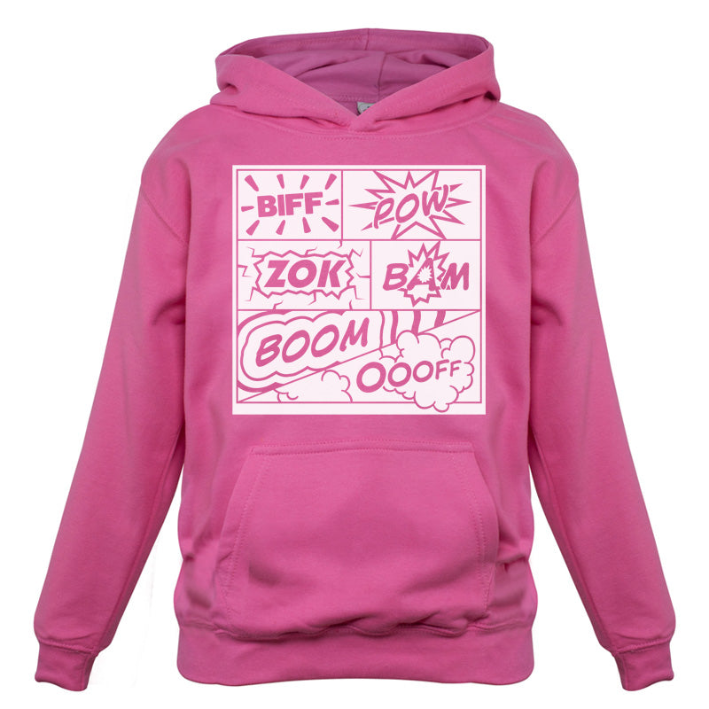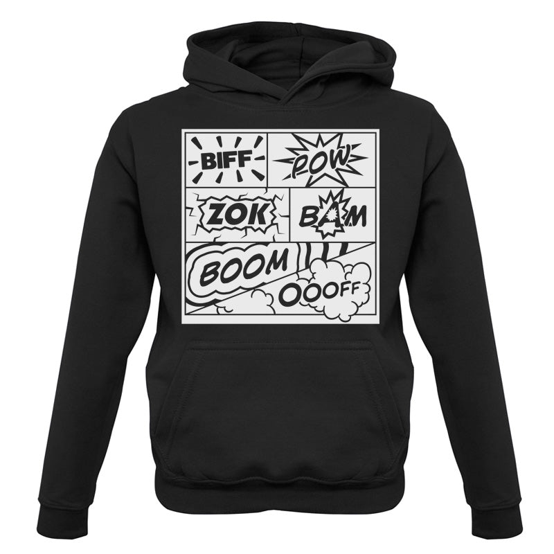 Kids Hoodie: Our kids unisex style Biff Pow Bam Comic book Hoodie is printed on our 300 GSM kangaroo pocket hooded top and is available on 7 different Colours.