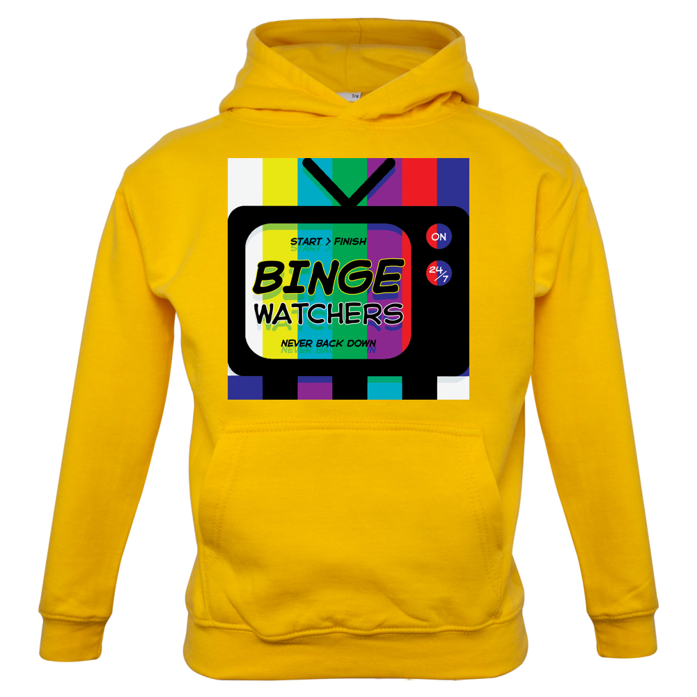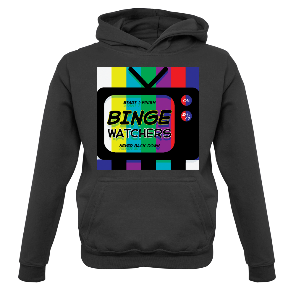 Kids Hoodie: Our kids unisex style Binge Watchers Hoodie is printed on our 300 GSM kangaroo pocket hooded top and is available on 7 different Colours.