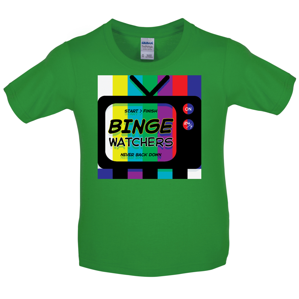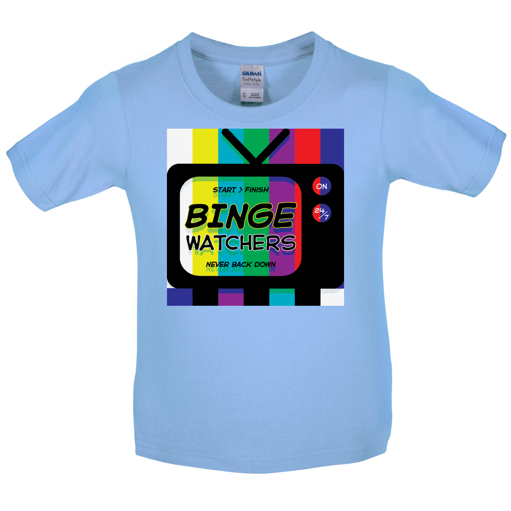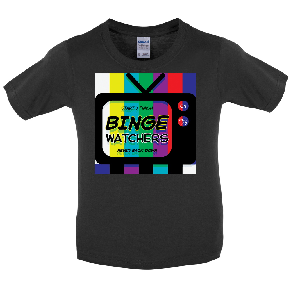 Kids T-shirt: Our Kid's Unisex style Binge Watchers T-shirt is printed on our 150 GSM ringspun cotton garment and is available on 8 different colours.