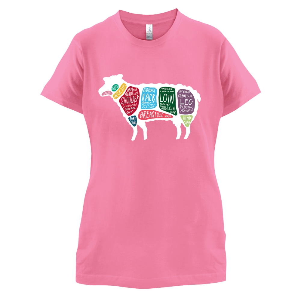 Women's Slim fit T-shirt, our ladies Butcher Sheep Diagram t-shirt is printed on our popular 150 GSM ring spun womens garment. Available in 11 colours and from Size Small to XXL.