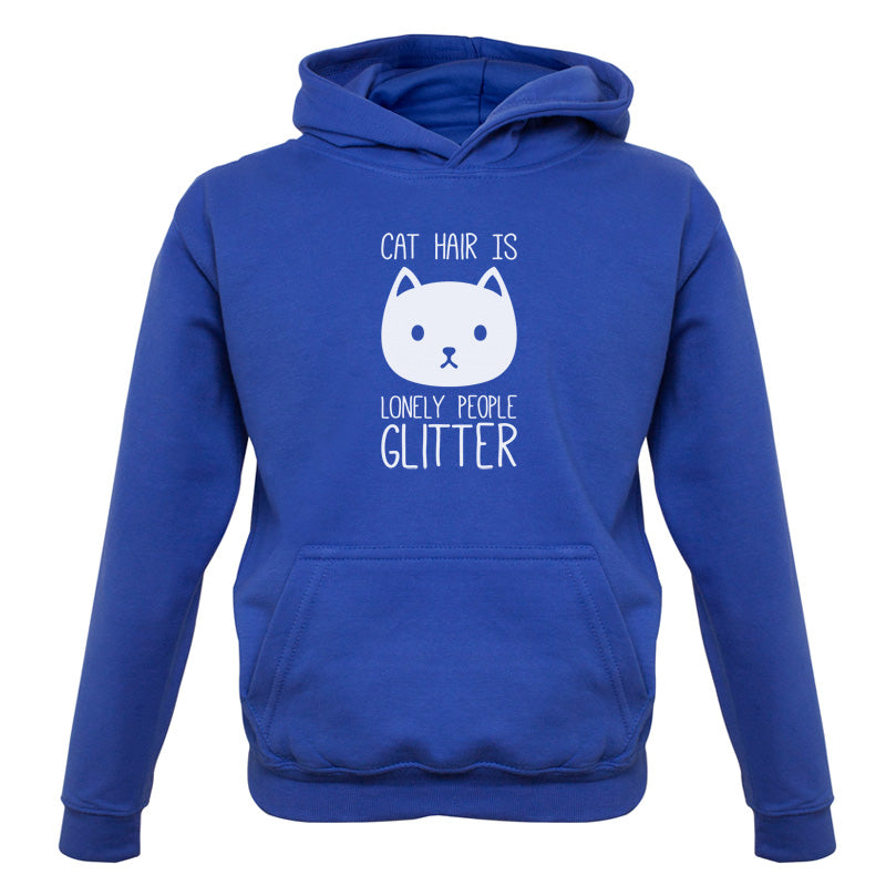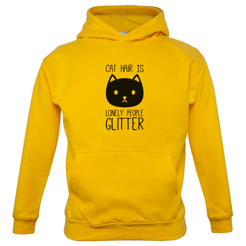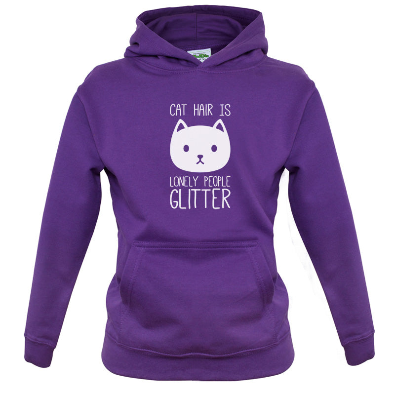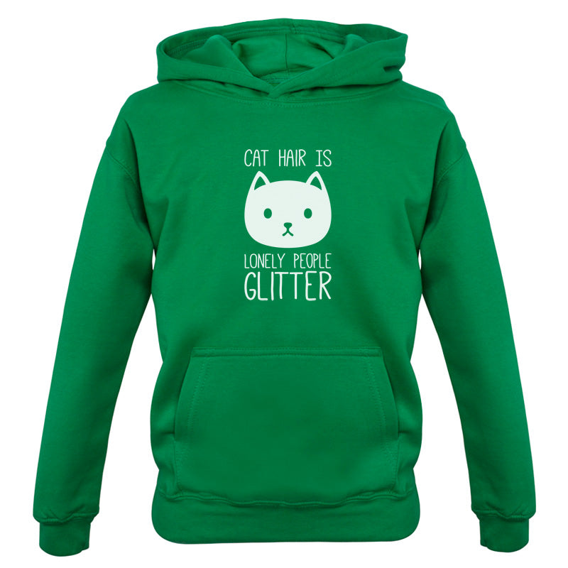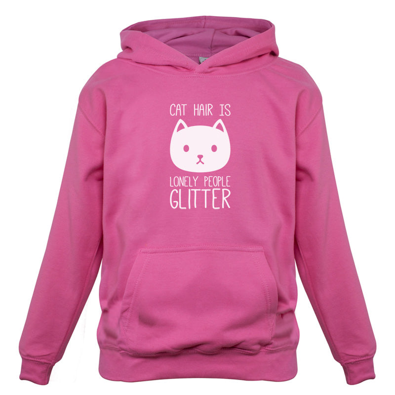 Kids Hoodie: Our kids unisex style Cat Hair Is Lonely People Glitter Hoodie is printed on our 300 GSM kangaroo pocket hooded top and is available on 7 different Colours.