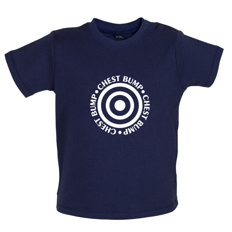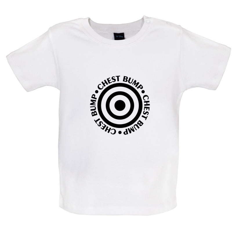 Baby/Toddler T-shirt: Our Baby Unisex style Chest Bump T-shirt is printed on our high quality 200 gsm ringspun cotton garment which features shoulder poppers to ease getting your little one dressed. Our Baby T-shirts are available in a choice of Eight colours.