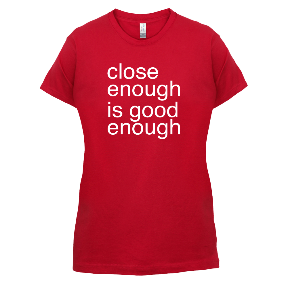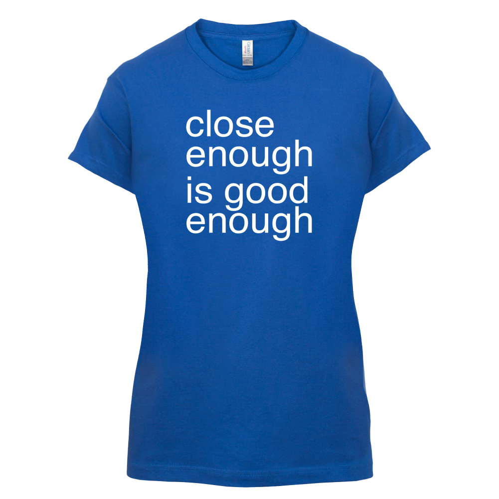 Women's Slim fit T-shirt, our ladies Close Enough is Good Enough t-shirt is printed on our popular 150 GSM ring spun womens garment. Available in 11 colours and from Size Small to XXL.