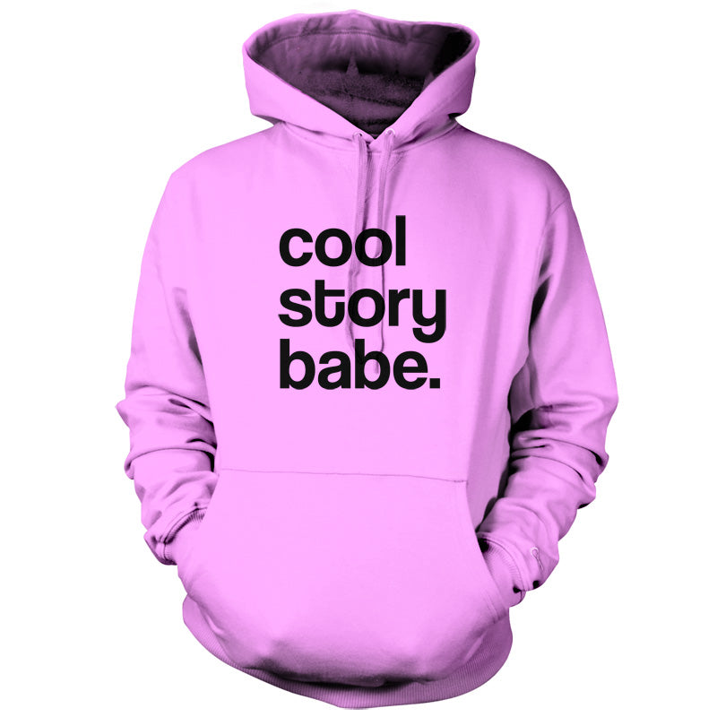 Unisex Hoodie, Our unisex style Cool Story Babe Hooded top is printed on our 280 GSM kangaroo pocket garment and is Available in 9 Colours and with sizes Small to XXL.