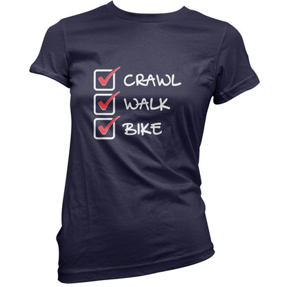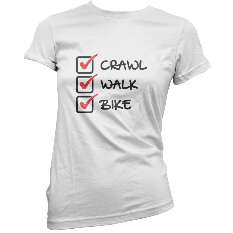 Women's Slim fit T-shirt, our ladies Crawl Walk Bike t-shirt is printed on our popular 150 GSM ring spun womens garment. Available in 11 colours and from Size Small to XXL.