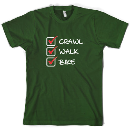 Mens Unisex T-Shirt, our men's Crawl Walk Bike t shirt is printed onto our premium 190 GSM one piece crew neck t-shirt. Available in 10 Colours and from Size Small to XXL.
