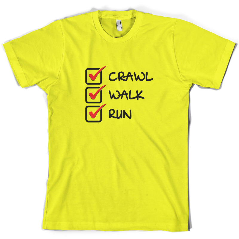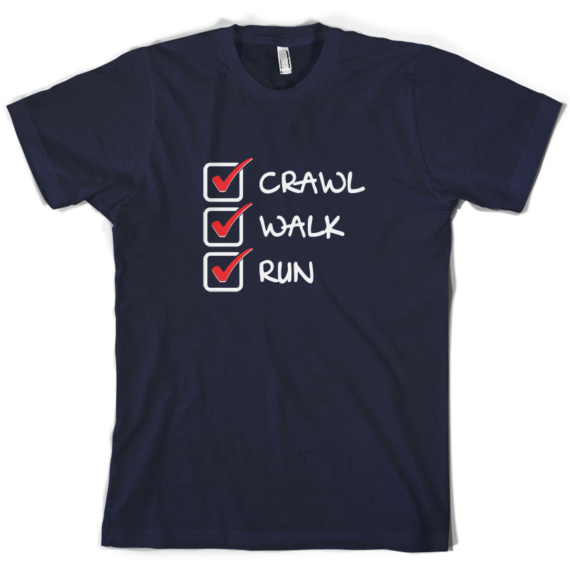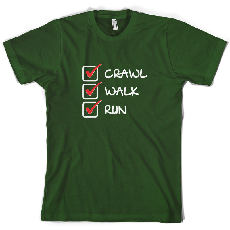 Mens Unisex T-Shirt, our men's Crawl Walk Run t shirt is printed onto our premium 190 GSM one piece crew neck t-shirt. Available in 10 Colours and from Size Small to XXL.