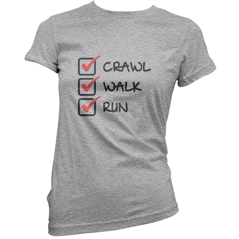 Women's Slim fit T-shirt, our ladies Crawl Walk Run t-shirt is printed on our popular 150 GSM ring spun womens garment. Available in 11 colours and from Size Small to XXL.