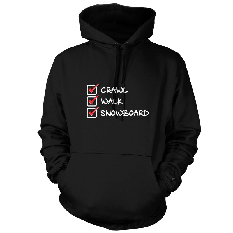 Unisex Hoodie, Our unisex style Crawl Walk Snowboard Hooded top is printed on our 280 GSM kangaroo pocket garment and is Available in 9 Colours and with sizes Small to XXL.