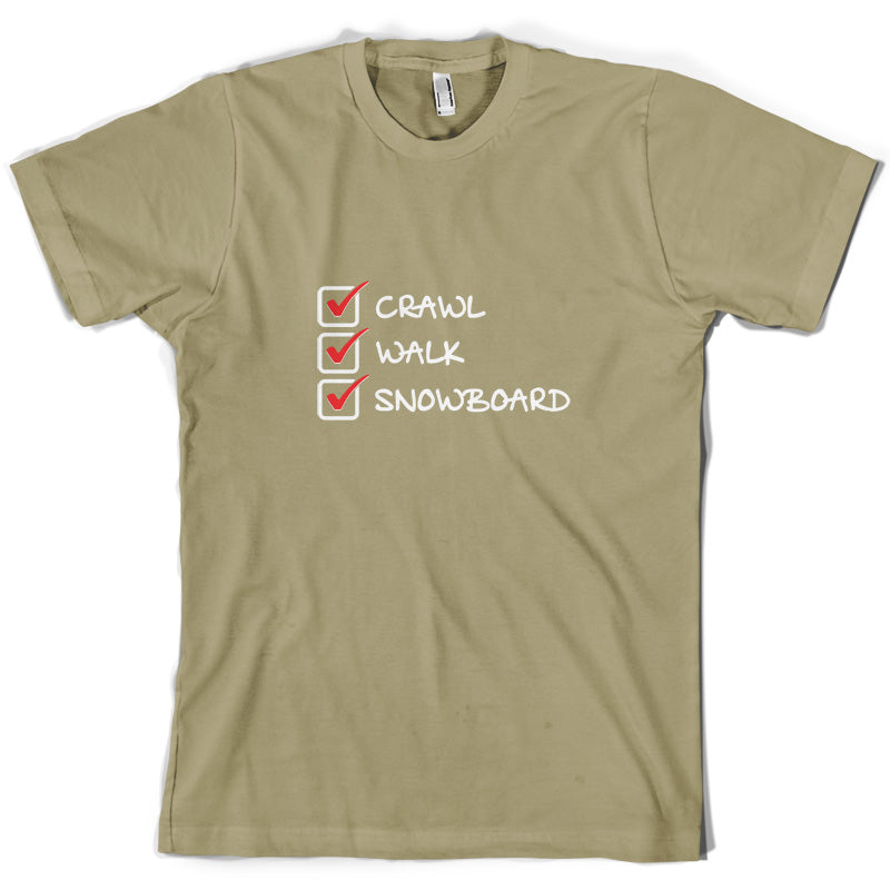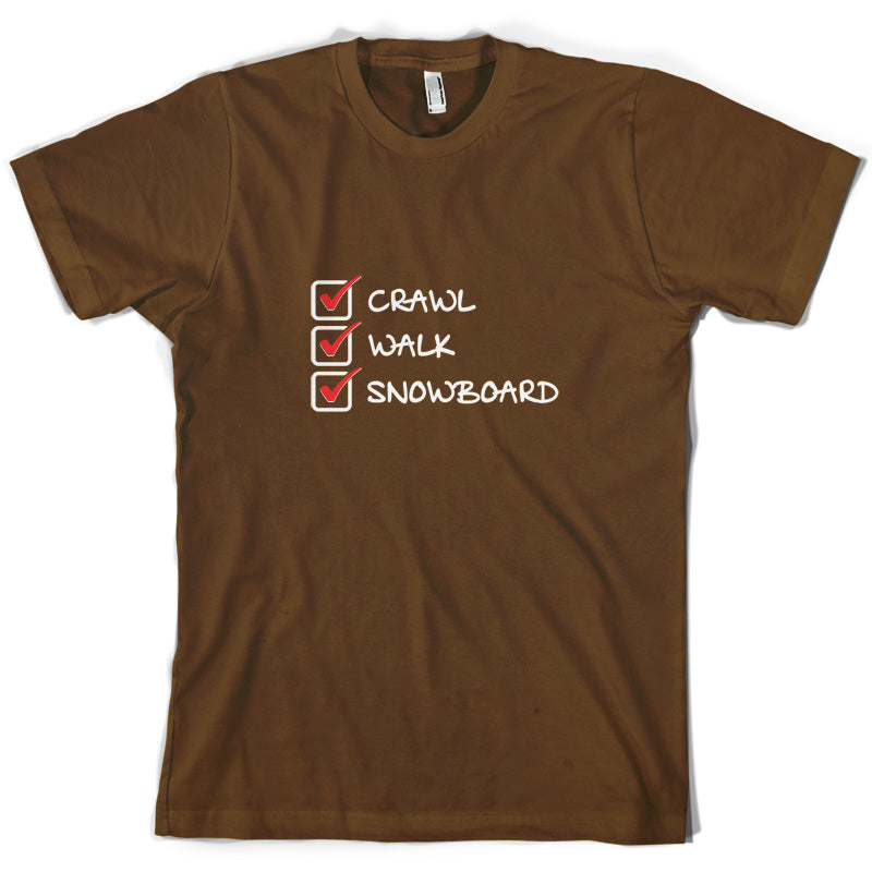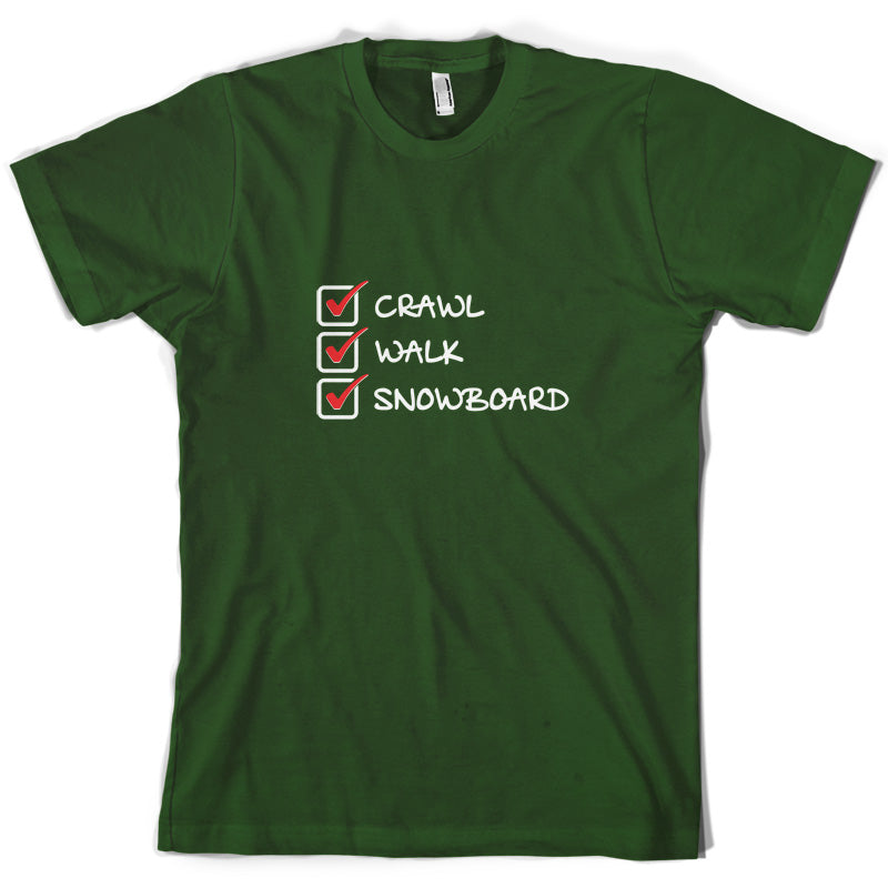 Mens Unisex T-Shirt, our men's Crawl Walk Snowboard t shirt is printed onto our premium 190 GSM one piece crew neck t-shirt. Available in 10 Colours and from Size Small to XXL.