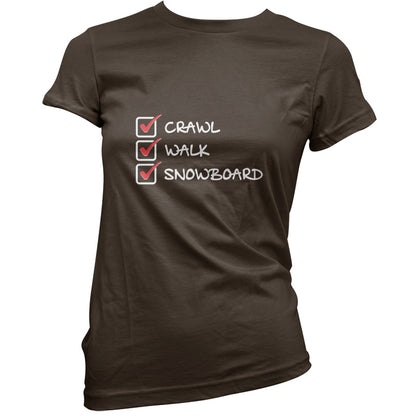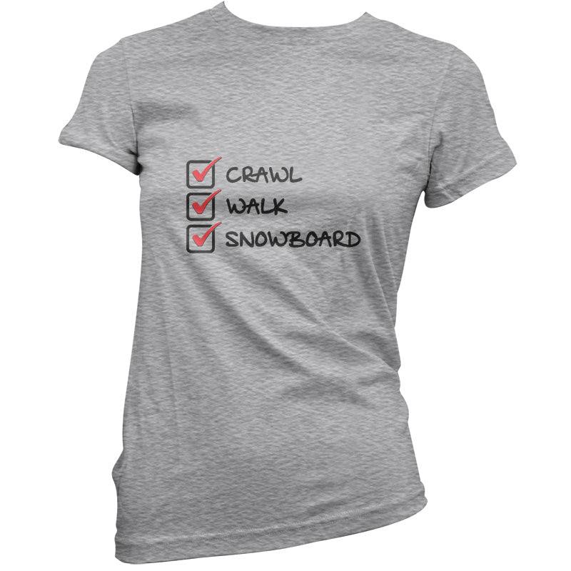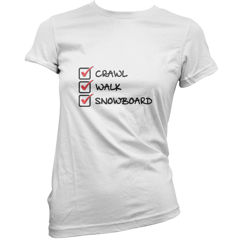Women's Slim fit T-shirt, our ladies Crawl Walk Snowboard t-shirt is printed on our popular 150 GSM ring spun womens garment. Available in 11 colours and from Size Small to XXL.