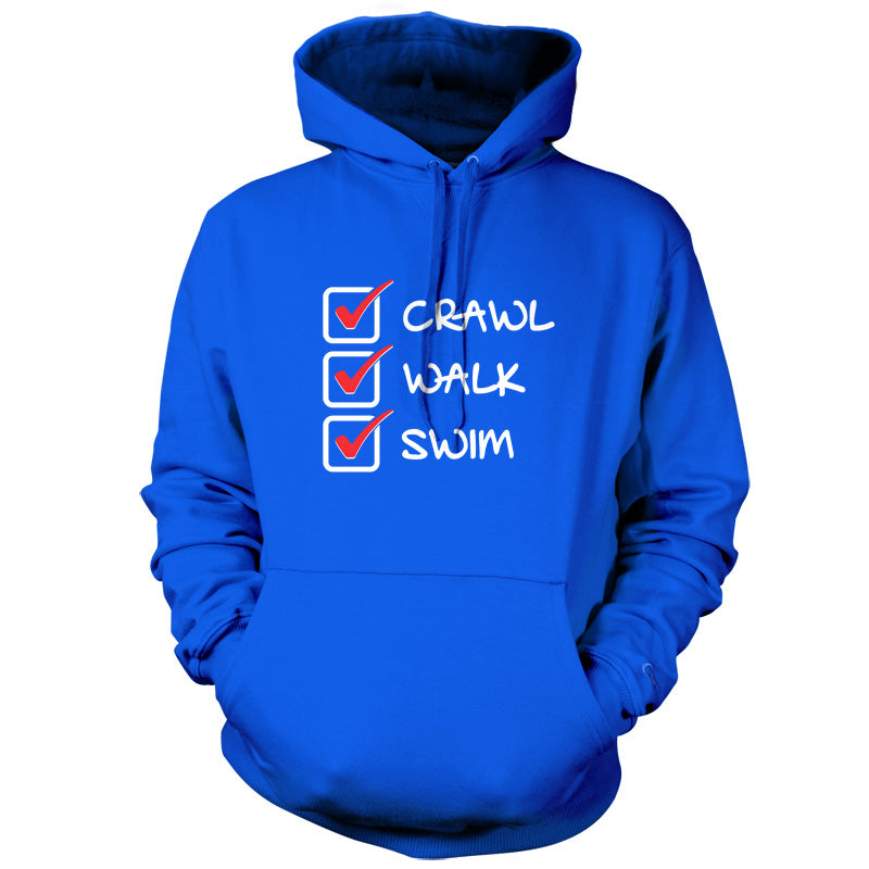 Unisex Hoodie, Our unisex style Crawl Walk Swim Hooded top is printed on our 280 GSM kangaroo pocket garment and is Available in 9 Colours and with sizes Small to XXL.