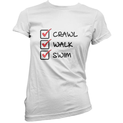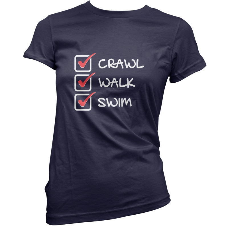 Women's Slim fit T-shirt, our ladies Crawl Walk Swim t-shirt is printed on our popular 150 GSM ring spun womens garment. Available in 11 colours and from Size Small to XXL.