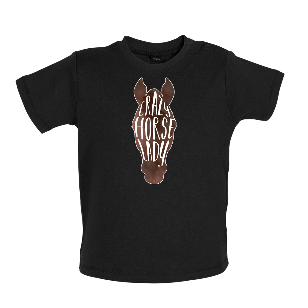 Baby/Toddler T-shirt: Our Baby Unisex style Crazy Horse Lady T-shirt is printed on our high quality 200 gsm ringspun cotton garment which features shoulder poppers to ease getting your little one dressed. Our Baby T-shirts are available in a choice of Eight colours.