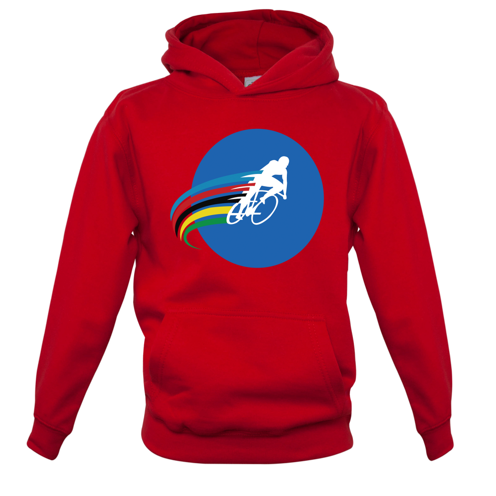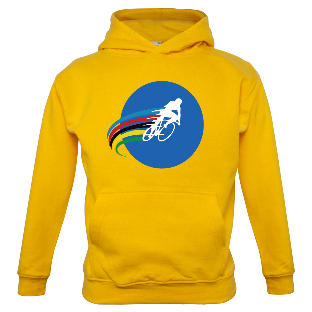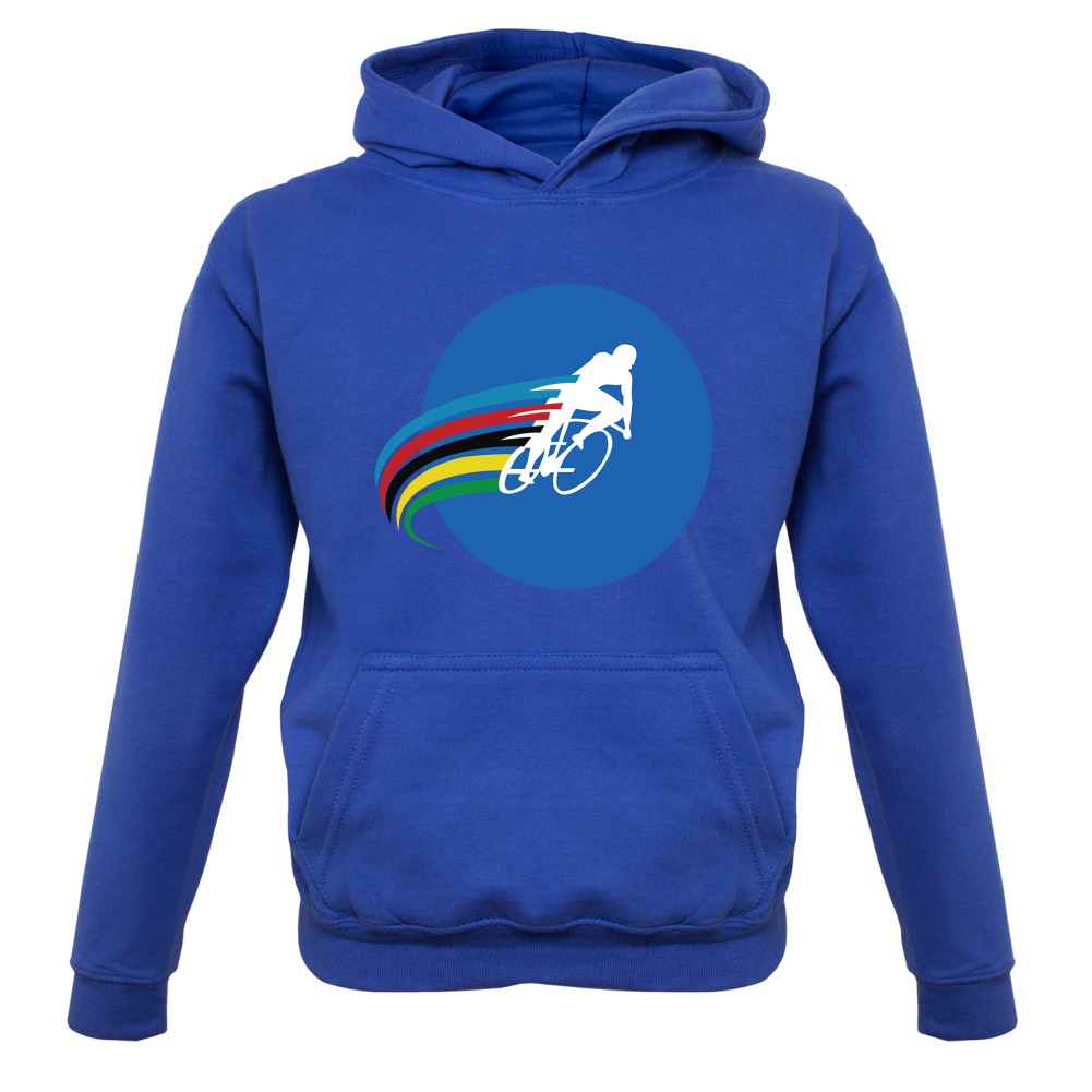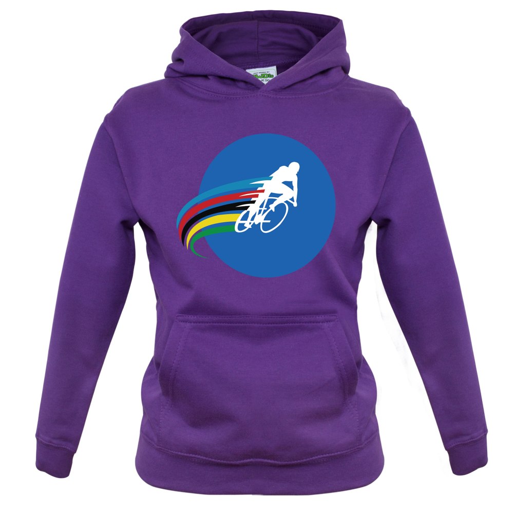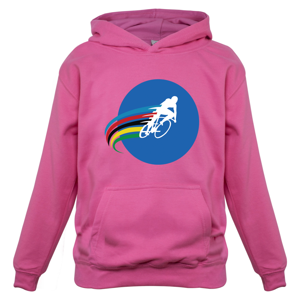 Kids Hoodie: Our kids unisex style Cycling Stripes Hoodie is printed on our 300 GSM kangaroo pocket hooded top and is available on 7 different Colours.