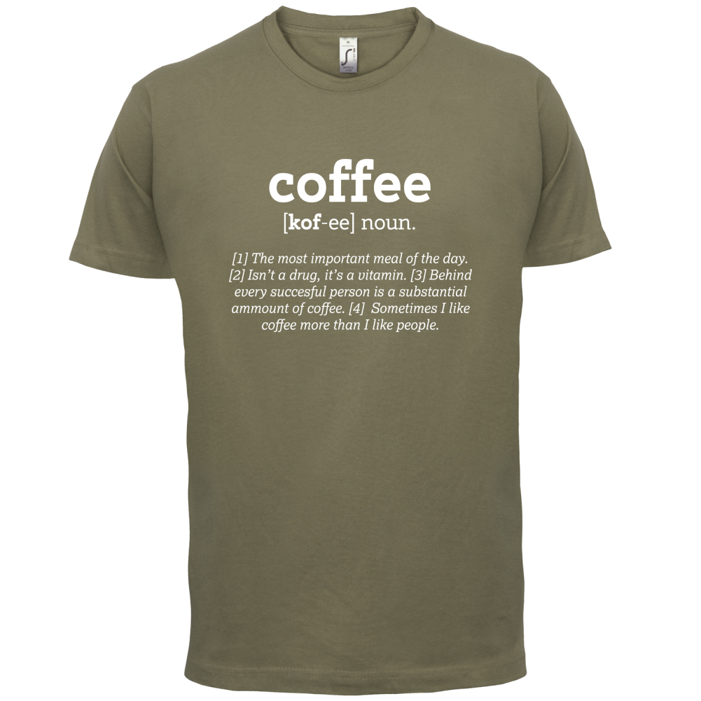 Mens Unisex T-Shirt, our men's Definition Coffee t shirt is printed onto our premium 190 GSM one piece crew neck t-shirt. Available in 10 Colours and from Size Small to XXL.