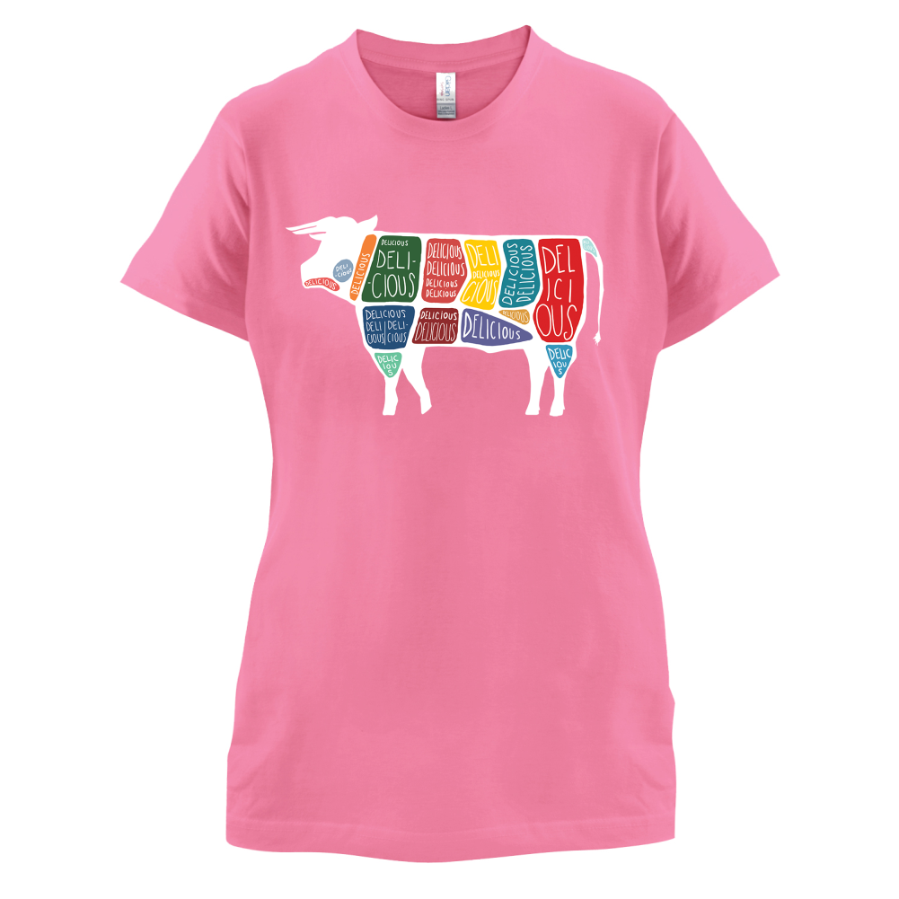 Women's Slim fit T-shirt, our ladies Delicious Cow t-shirt is printed on our popular 150 GSM ring spun womens garment. Available in 11 colours and from Size Small to XXL.