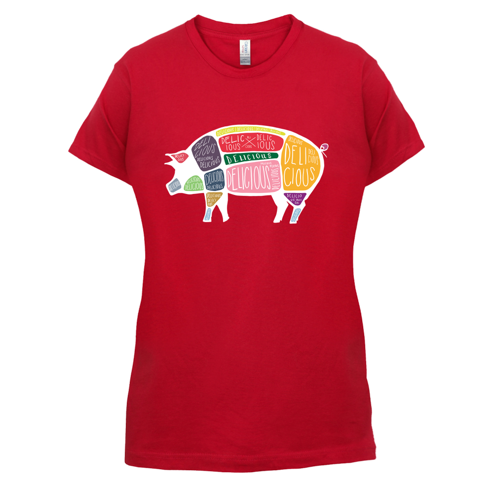 Women's Slim fit T-shirt, our ladies Delicious Pig t-shirt is printed on our popular 150 GSM ring spun womens garment. Available in 11 colours and from Size Small to XXL.
