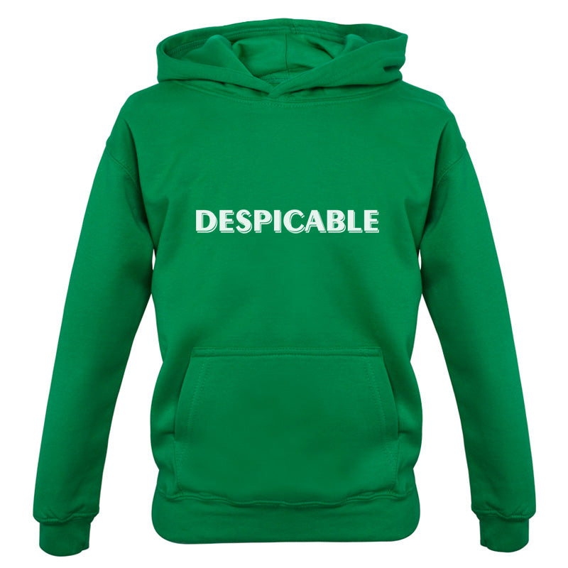 Kids Hoodie: Our kids unisex style Despicable Hoodie is printed on our 300 GSM kangaroo pocket hooded top and is available on 7 different Colours.