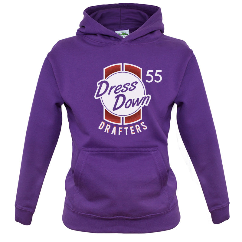 Kids Hoodie: Our kids unisex style Dressdown Drafters Hoodie is printed on our 300 GSM kangaroo pocket hooded top and is available on 7 different Colours.