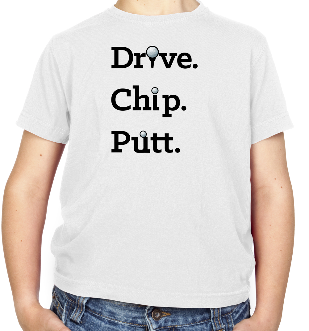 Kids T-shirt: Our Kid's Unisex style Drive Chip Putt T-shirt is printed on our 150 GSM ringspun cotton garment and is available on 8 different colours.
