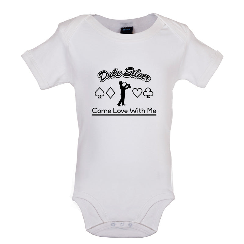 This Duke Silver Come Love With Me baby design is available in a choice of garments, use the menu on the right of this page to select your choice of the following: