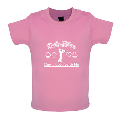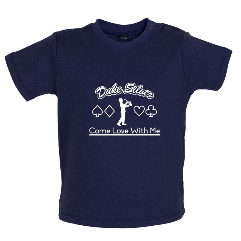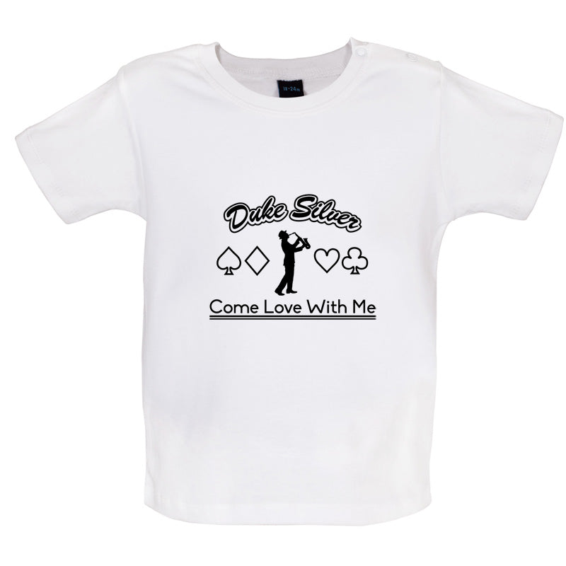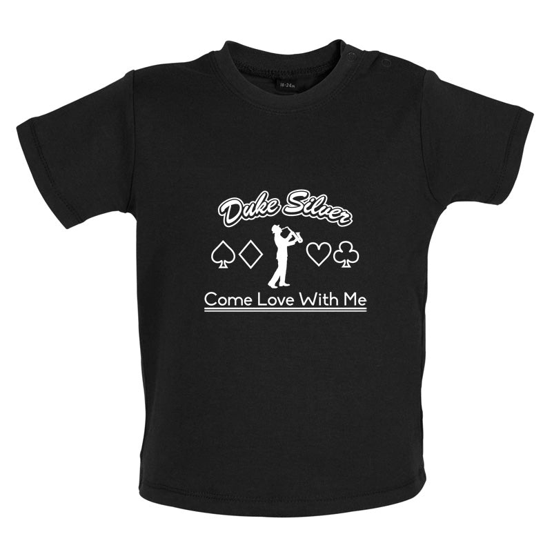 Baby/Toddler T-shirt: Our Baby Unisex style Duke Silver Come Love With Me T-shirt is printed on our high quality 200 gsm ringspun cotton garment which features shoulder poppers to ease getting your little one dressed. Our Baby T-shirts are available in a choice of Eight colours.
