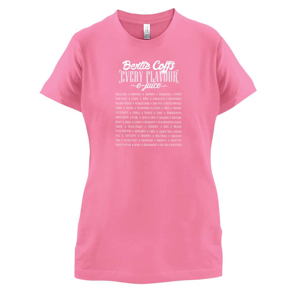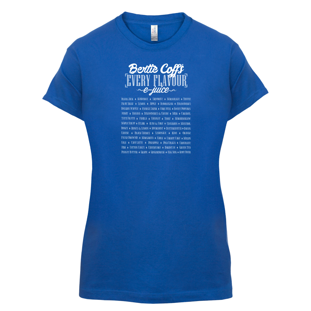 Women's Slim fit T-shirt, our ladies E-Juice Flavours t-shirt is printed on our popular 150 GSM ring spun womens garment. Available in 11 colours and from Size Small to XXL.