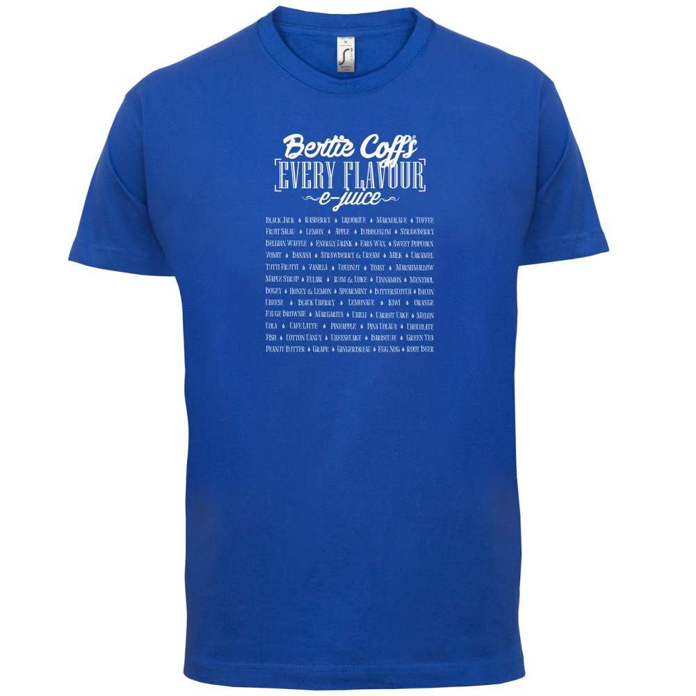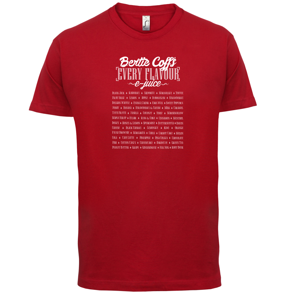 Mens Unisex T-Shirt, our men's E-Juice Flavours t shirt is printed onto our premium 190 GSM one piece crew neck t-shirt. Available in 10 Colours and from Size Small to XXL.